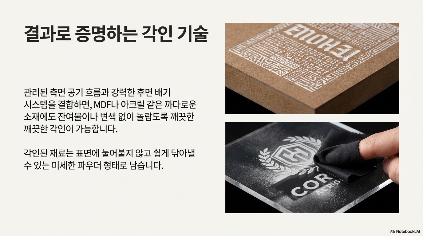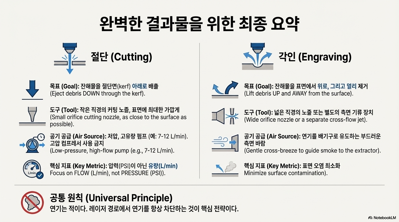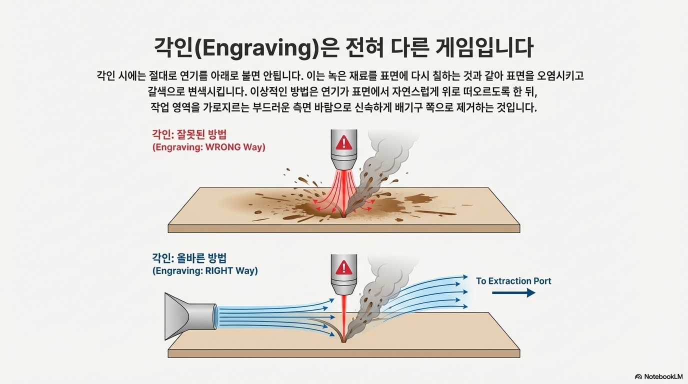 - 커팅과 각인은 정반대의 공기 흐름 전략을 요구합니다.