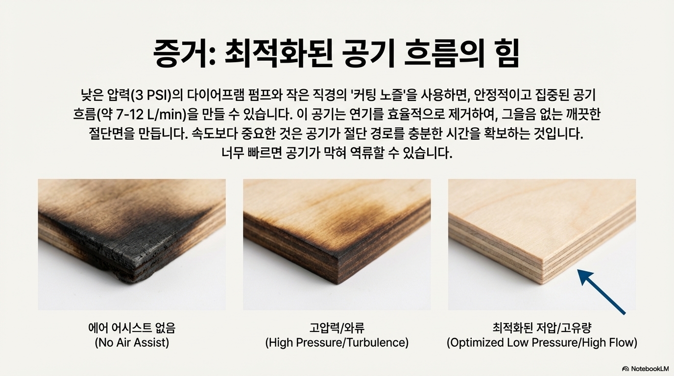 레이저 커팅기를 사용하는 분이라면 누구나 에어 어시스트 설정 문제로 골머리를 앓아본 경험이 있을 것입니다. "얼마나 높은 압력을 써야 할까?", "언제 켜고 언제 꺼야 할까?" 커뮤니티와 포럼에는 수많은 조언이 넘쳐나지만, 서로 상충하거나 근거가 부족한 경우가 많아 오히려 더 큰 혼란을 야기하곤 합니다. 저 역시 이러한 혼란스러운 정보들에 답답함을 느끼곤 했습니다.