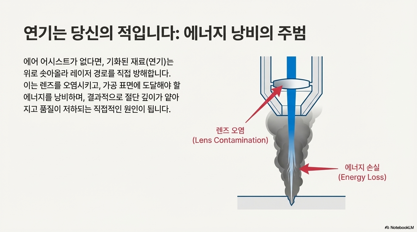 이것이 왜 중요할까요? 이 입자들은 단순한 물리적 장벽이 아닙니다. 레이저 빔이 가공물 표면에 도달하기 전에 이 고체 입자 구름을 통과하면서, 입자들은 레이저 에너지를 흡수하여 공중에서 다시 가열됩니다. 즉, 연기는 레이저의 힘을 중간에서 가로채는 **'에너지 도둑'**인 셈입니다. 정작 재료를 가공해야 할 에너지가 공중에서 낭비되면서 커팅 효율은 급격히 떨어지고 절단면의 품질은 저하되는 것입니다.