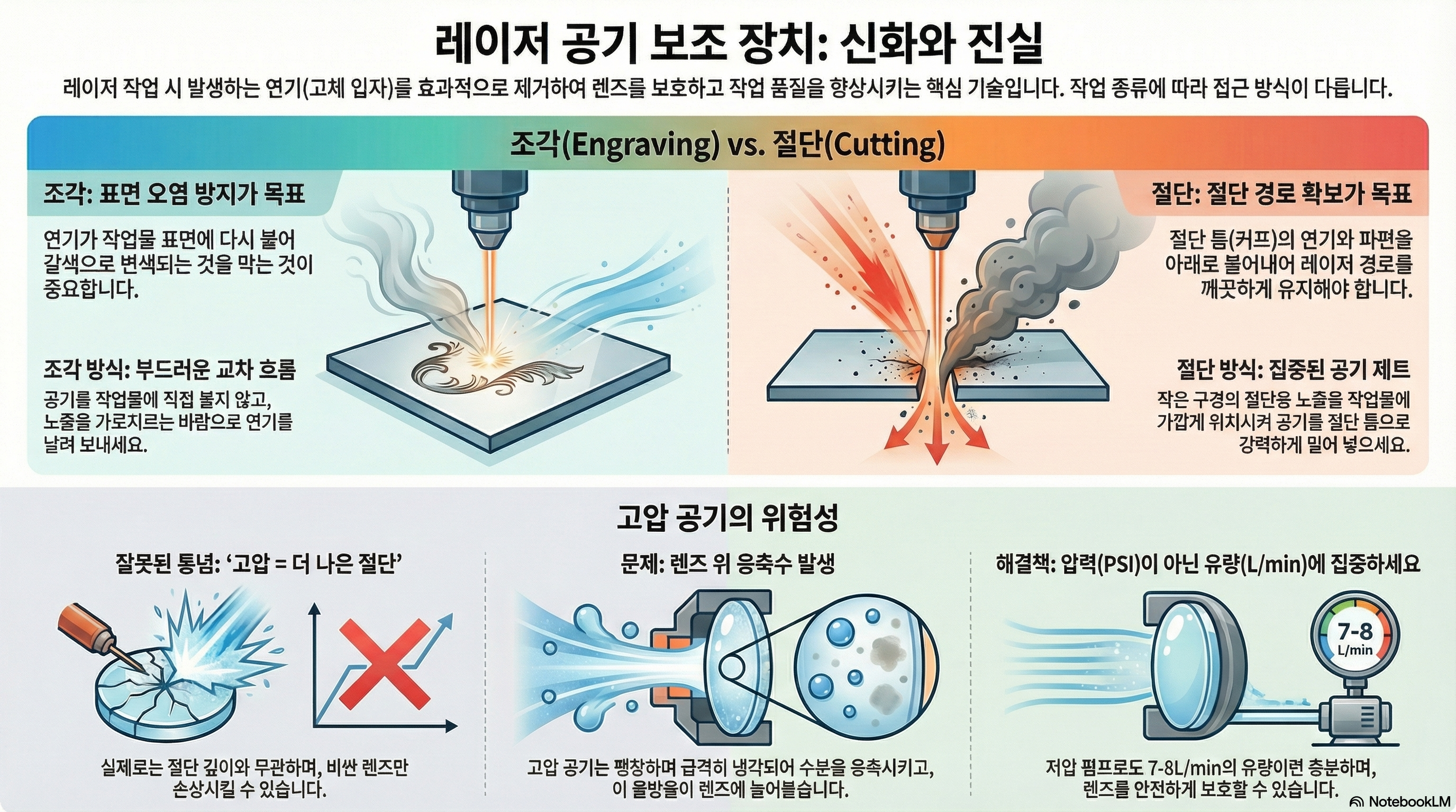 많은 사용자들이 커팅과 각인에 동일한 에어 어시스트 설정을 사용하지만, 두 작업은 공기 흐름에 있어 완전히 상반된 요구사항을 가집니다.