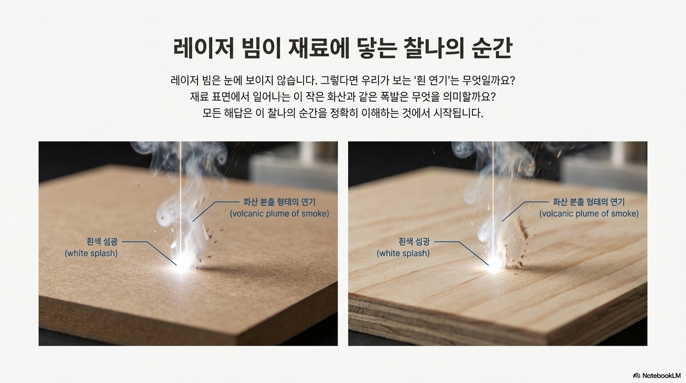 레이저가 재료에 닿을 때 마치 작은 화산처럼 솟아오르는 하얀 연기를 본 적 있으실 겁니다. 우리는 흔히 이를 '기체'라고 생각하지만, 이것이 첫 번째 오해입니다. 이 연기의 정체는 재료가 분해되어 공기 중에 떠다니는 미세한 **'고체 입자(solid particles)'**의 집합체입니다. 안개나 증기가 실제로는 기체가 아닌 미세한 물방울인 것과 같은 원리이죠. 이 고체 입자들이 빛을 난반사하기 때문에 우리 눈에 흰색으로 보이는 것입니다.