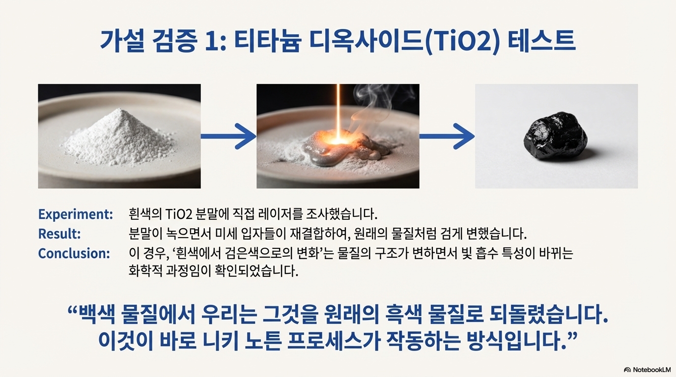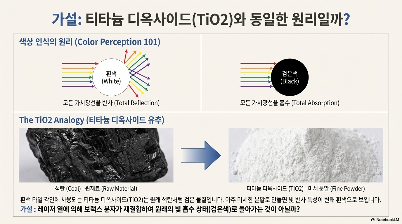 이 놀라운 결과 앞에서 자연스럽게 '왜?'라는 질문이 떠올랐습니다. 제 첫 번째 가설은 세라믹 타일에 각인할 때 사용하는 이산화티타늄(TiO2)과 비슷한 원리일 것이라는 추측이었습니다. 이른바 '니키 노턴(Nikki Norton)' 방식으로 알려진 이 기술은, 흰색의 이산화티타늄 가루에 레이저 열을 가해 검은색 물질로 되돌리는 화학적 변환을 이용합니다.