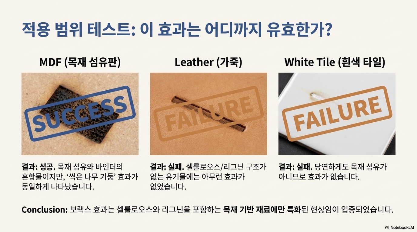 이 '셀룰로오스 선택적 제거' 가설을 최종 확인하기 위해, 셀룰로오스 구조가 없는 다른 재료들, 즉 가죽과 세라믹 타일에 동일한 실험을 진행했습니다. 결과는 명확했습니다. 두 재료 모두에서 붕사는 아무런 효과를 나타내지 않았습니다. 이로써 붕사는 나무의 특정 성분과 반응하여 물리적 구조를 바꾸는 방식으로 작동한다는 사실이 입증되었습니다.