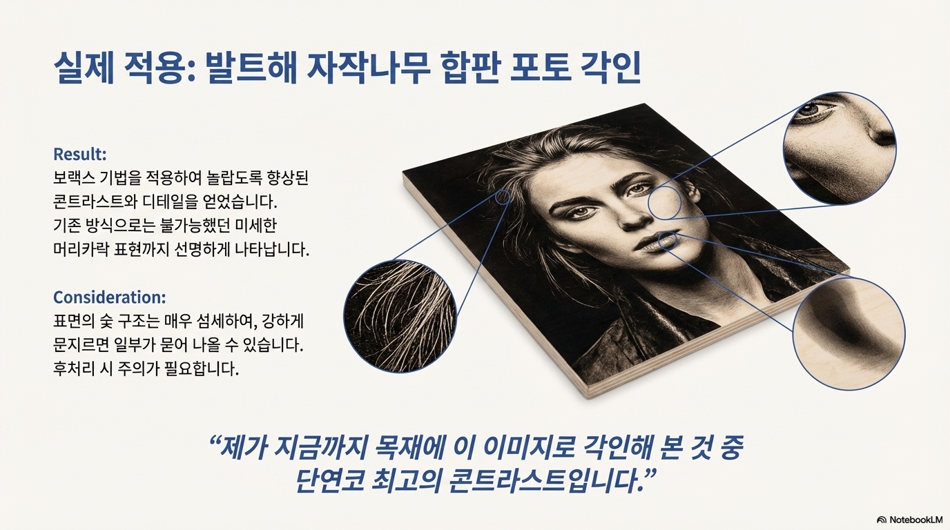 실험 과정은 놀랍도록 간단합니다. 붕사를 물에 녹여 자작나무 합판 표면에 얇게 바른 뒤, 평소처럼 레이저로 각인하는 것입니다. 결과는 그야말로 충격적이었습니다. 붕사를 처리한 부분과 그렇지 않은 부분의 색상 차이는 단순한 농도 차이가 아닌, 완전히 다른 색을 만들어냈습니다.