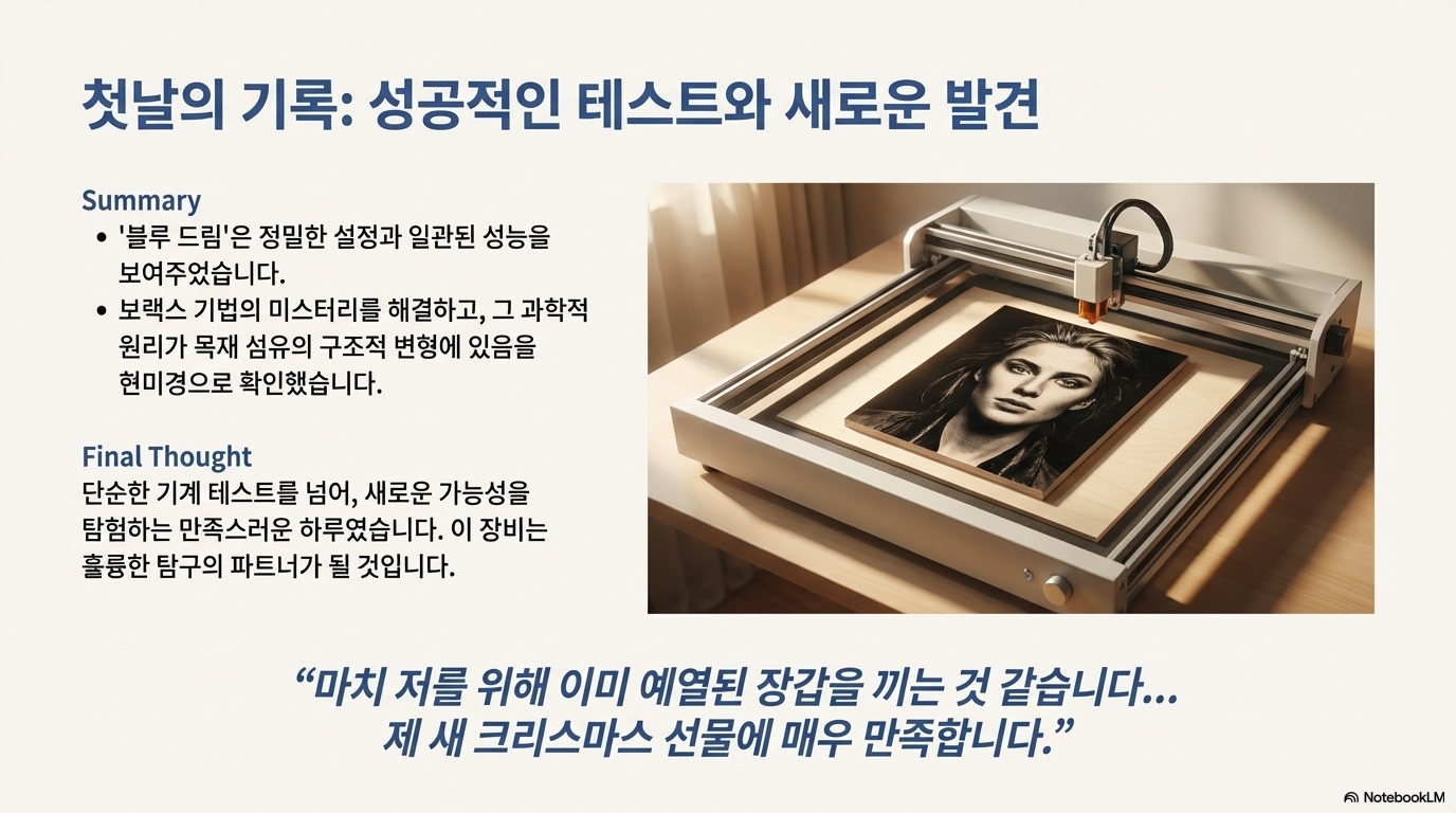 오늘 우리는 두 가지 흥미로운 발견을 했습니다. 첫째, 붕사라는 평범한 재료가 가설과 검증을 통해 나무의 셀룰로오스 구조를 변화시켜 빛을 흡수하는 3D 골격을 만들어낸다는 놀라운 과학적 원리. 둘째, 아날로그 노브로 최대 전류를 물리적으로 제한하여 고가의 레이저 튜브를 안전하게 보호하는 새로운 장비의 스마트한 기능.