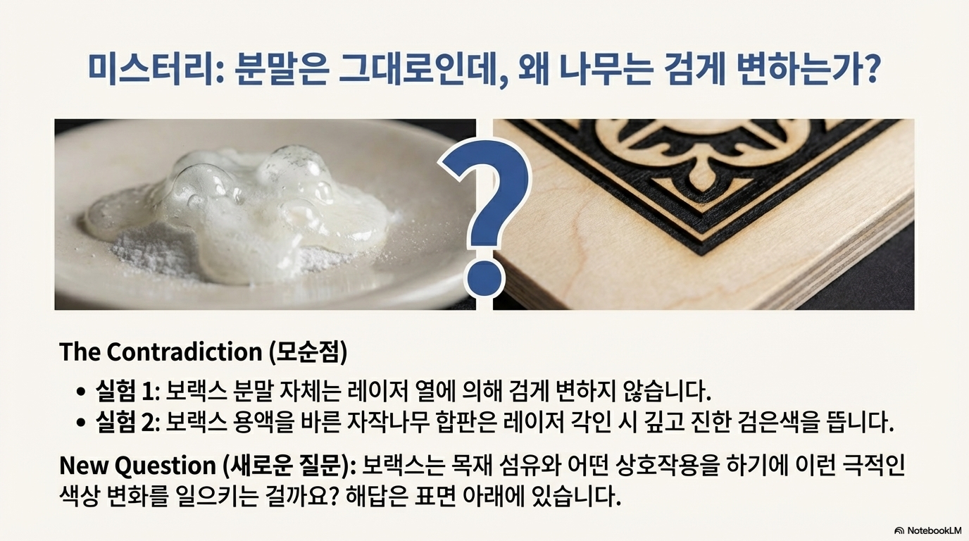 같은 실험을 순수한 붕사 가루에 반복했습니다. 하지만 결과는 예상과 달랐습니다. 붕사 가루는 레이저 열에도 불구하고 검게 변하지 않았습니다. 오직 나무와 함께 있을 때만 검은색 효과가 나타난 것입니다. 이로써 첫 번째 가설, 즉 붕사 자체가 변하는 것이라는 추측은 완전히 기각되었습니다. 이것은 이산화티타늄과는 전혀 다른 메커니즘이 작동하고 있음을 의미했습니다.