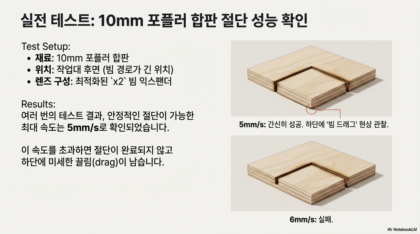 애초에 30와트 기계로 10mm 포플러 합판을 자르겠다는 목표 자체가 무모해 보일 수 있습니다. 하지만 이 실험은 저출력 장비에 숨겨진 엄청난 잠재력을 증명했습니다.
