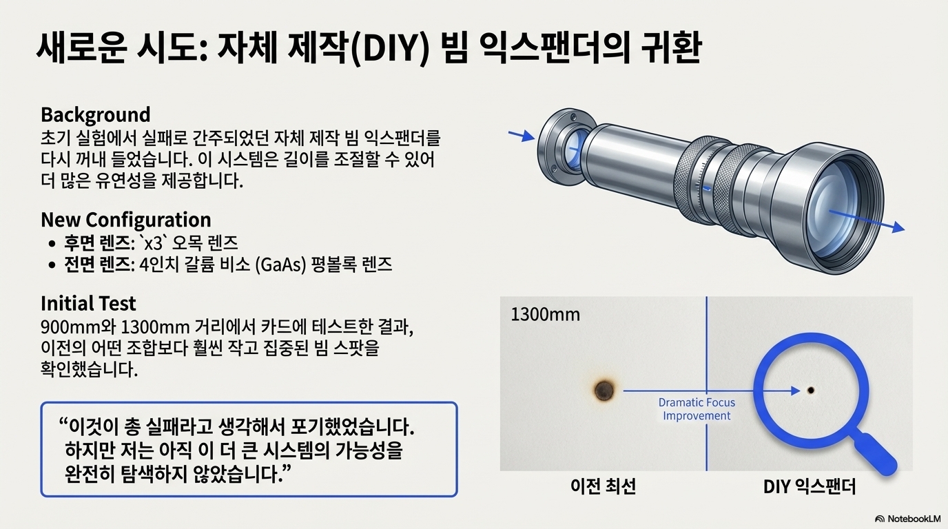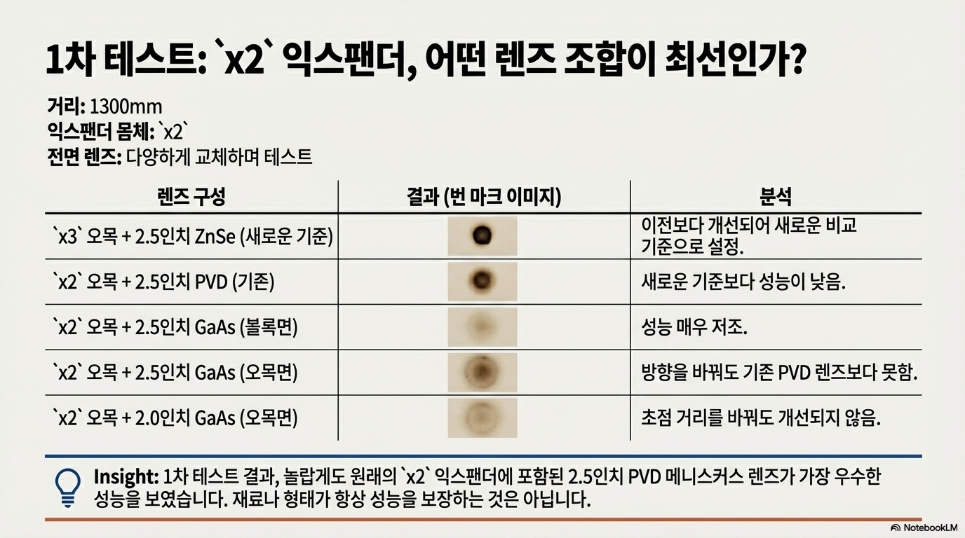 실험 과정은 PVD, CVD, 갈륨 비소(Gallium Arsenide), 아연 셀렌화물(Zinc Selenide) 등 다양한 재료의 렌즈를 수없이 교체하고 조합하는 고된 작업의 연속이었습니다. 이 과정에서 광학 시스템이 얼마나 민감하며, 아주 사소한 변화가 얼마나 극적인 결과 차이를 만드는지가 명확히 드러났습니다.