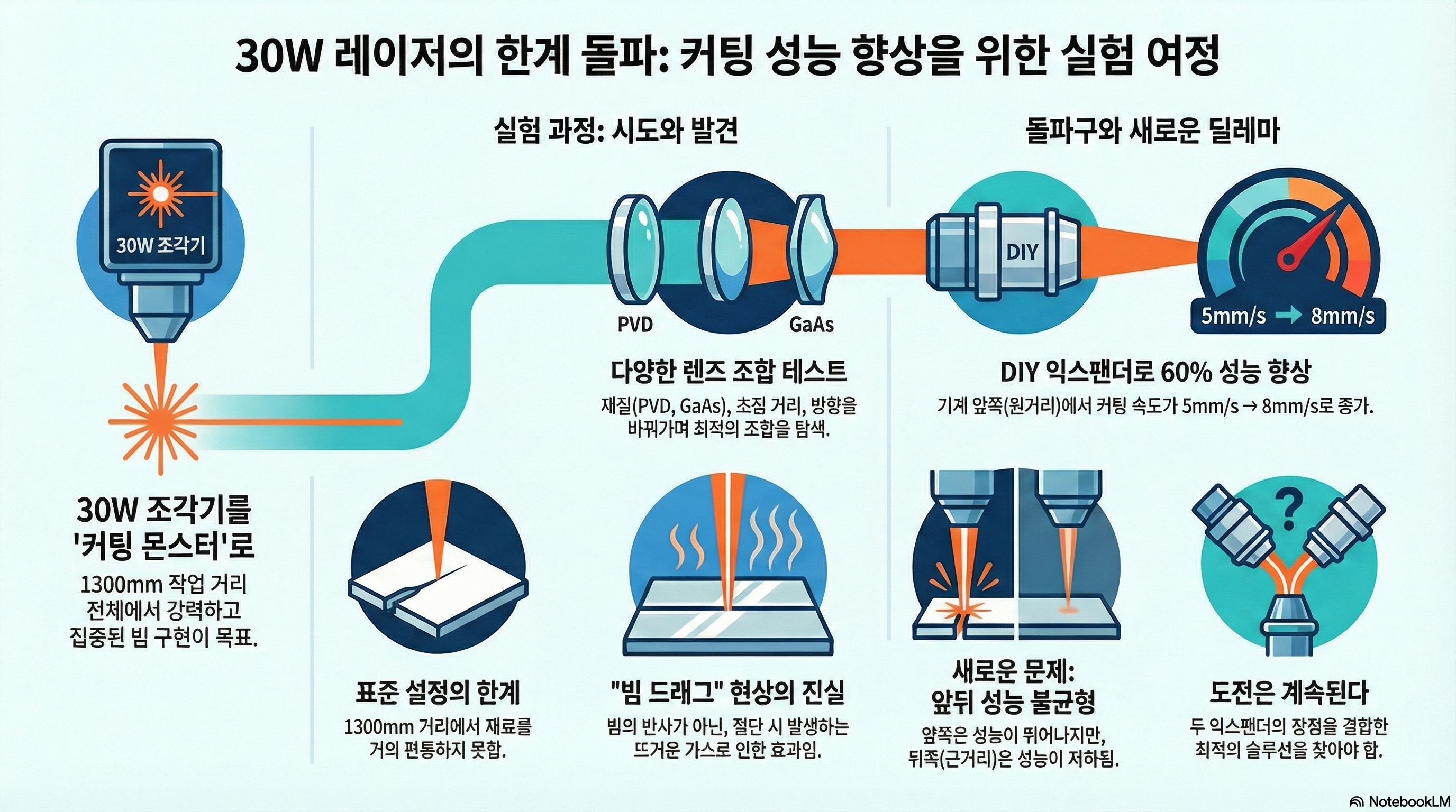 놀라운 점은 이 잠재력이 바로 앞서 언급한 '비성공'적인 실험 결과 속에서 발견되었다는 것입니다. 한 설정은 기계 뒤쪽에서는 평범한 성능을 보였지만, 앞쪽에서는 10mm 합판 절단 속도를 기존 초속 5mm에서 8mm로 끌어올렸습니다. 이는 무려 60%의 성능 향상을 의미합니다. 이 결과는 완벽한 성공은 아니었지만, 올바른 조건만 갖춰진다면 30와트 레이저가 상상 이상의 성능을 발휘할 수 있음을 명확히 보여주었습니다. 우리가 가진 도구의 한계를 너무 쉽게 단정하고 있지는 않은지, 그리고 최적화의 힘이 얼마나 대단한지를 다시 한번 생각하게 만듭니다.