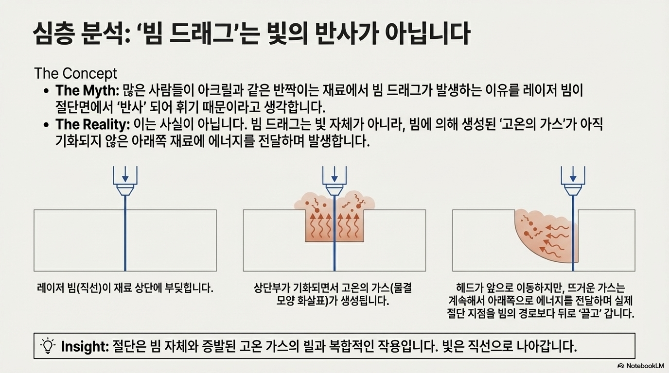 두꺼운 재료를 레이저로 자를 때, 절단면 아래쪽이 뒤로 밀리며 곡선을 그리는 '빔 드래그(beam drag)' 현상은 흔히 볼 수 있습니다. 많은 사람들은 이 현상이 레이저 빔이 재료 내부에서 반사되거나 휘기 때문에 발생한다고 생각합니다. 하지만 20mm 두께의 아크릴을 이용한 실험은 이 통념이 완전히 틀렸음을 보여주었습니다.