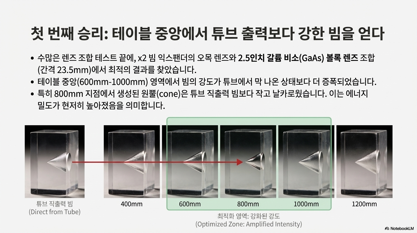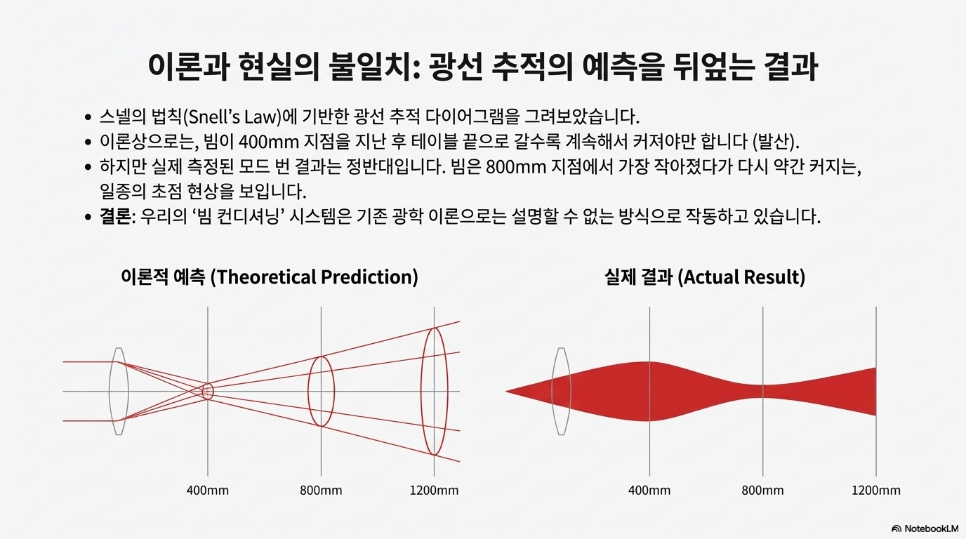 이론을 버리고 현상에만 집중하자, 놀라운 발견이 이어졌습니다. 그는 기존의 '빔 확장기(beam expander)'를 '빔 컨디셔너(beam conditioner)'라는 새로운 이름으로 불렀습니다. 이는 단순한 용어 변경이 아니었습니다. 최종 집속 렌즈에 도달하기 전에 빔의 상태를 미리 조절하는 것, 즉 '빔 컨디셔닝'이 최종 렌즈 자체의 성능을 극적으로 변화시킨다는 핵심적인 패러다임의 전환이었습니다.