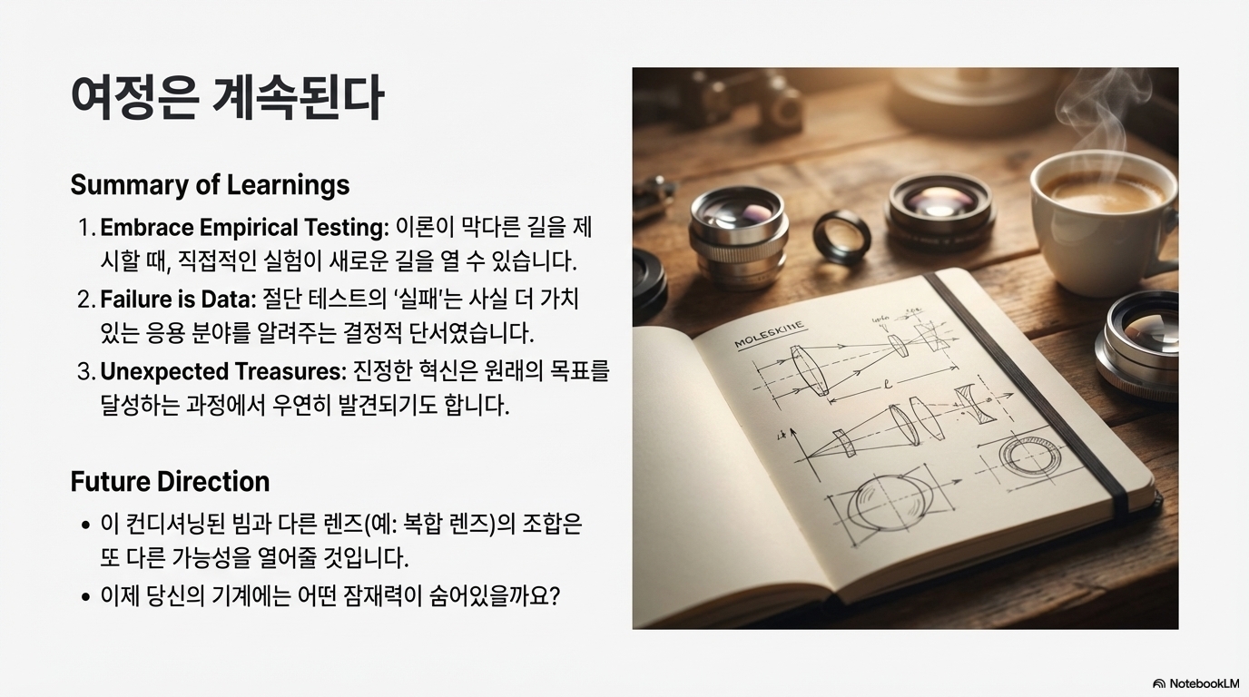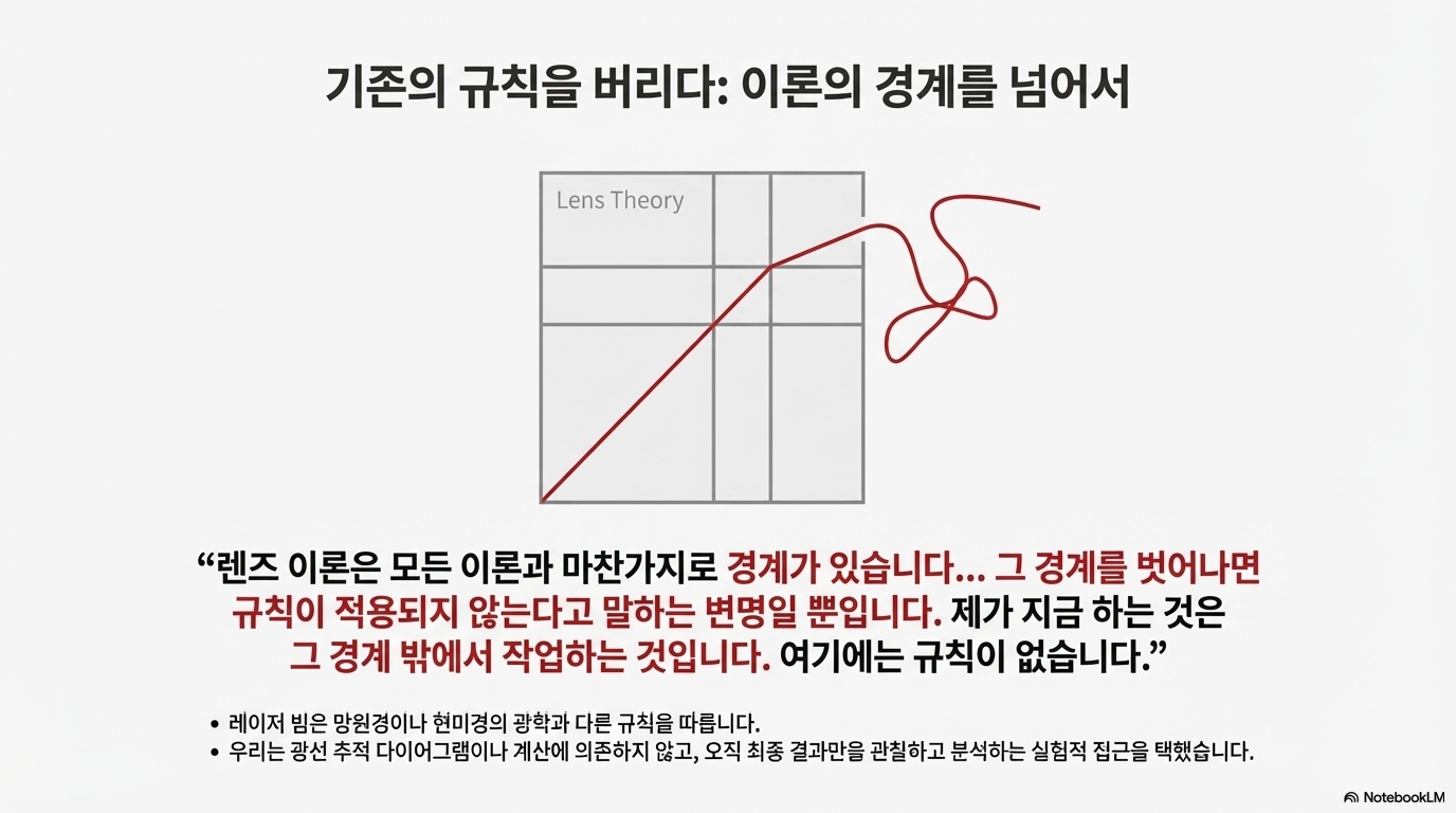 하지만 여기, 기존의 규칙에 정면으로 맞선 한 실험가가 있습니다. 그는 렌즈 이론이 망원경이나 현미경을 위해 완벽하게 설계되었을지는 몰라도, 자신의 레이저 커터에는 적용되지 않는다는 사실을 깨달았습니다. 이론이 현실을 설명하지 못하는 한계 지점에서, 그는 계산과 다이어그램을 과감히 버리는 반역을 선택했습니다. 그의 신념은 단 하나, 실제 세상의 결과만이 이론적 예측을 압도한다는 것이었습니다.