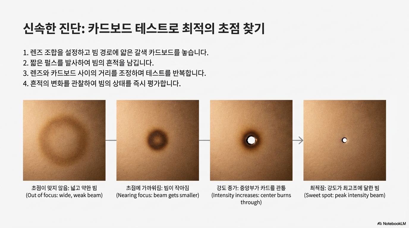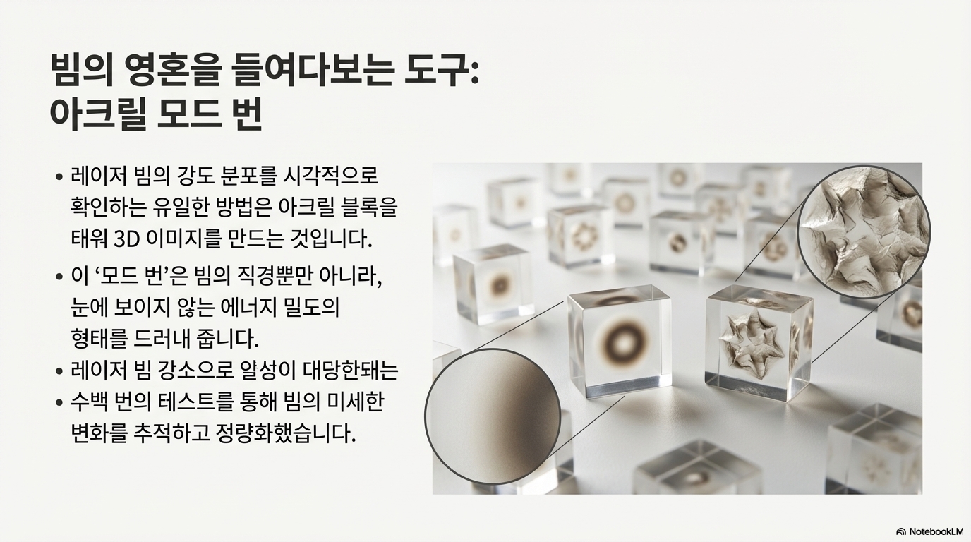 결과를 예측하는 대신, 그는 순수한 경험적 방법을 택했습니다. 투명 아크릴 블록에 빔을 태워 빔의 3차원적 강도 분포를 눈으로 확인하는 '모드 번(mode burn)'이 그의 나침반이 되었습니다. 혹은 얇은 갈색 종이 카드를 사용해 빔의 상태를 즉각적으로 판단했습니다. 작고 깨끗한 구멍은 강력한 에너지가 집중되었음을, 넓게 그을린 자국은 빔이 약하고 분산되었음을 의미했습니다. 이처럼 그는 복잡한 계산 대신 실제 현상에 모든 것을 걸었습니다.