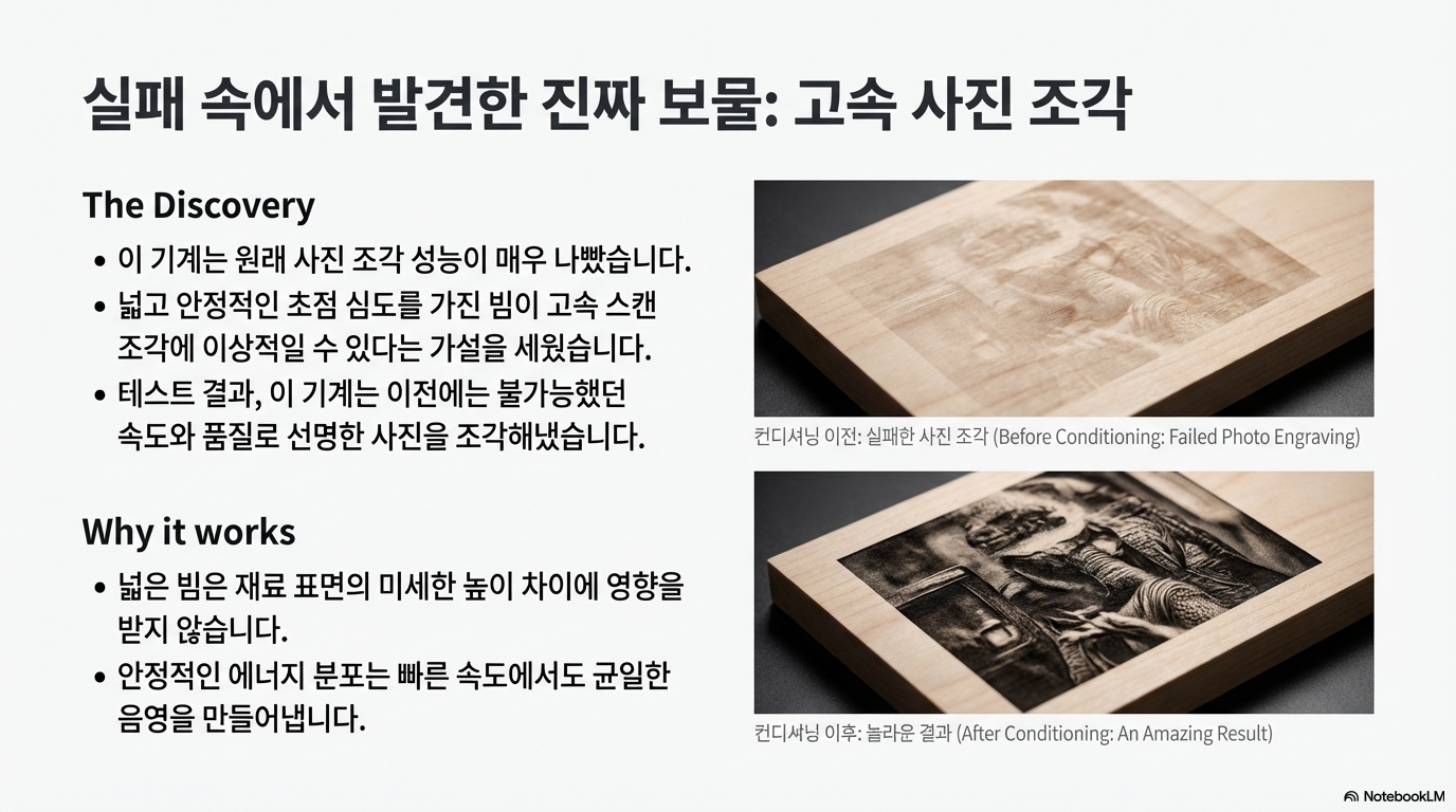 더 얇고 정밀한 커팅 라인을 만들려는 시도가 표면적으로는 기대에 미치지 못하는 순간이었습니다. 그러나 그는 자신의 개조가 기계의 완전히 새로운 잠재력을 열었음을 우연히 깨달았습니다. 강력한 커팅에는 부적합해 보였던 그 빔의 특성이, 역설적으로 고속으로 미세한 음영을 표현하는 데는 최적화된 시스템을 만들어낸 것입니다.
