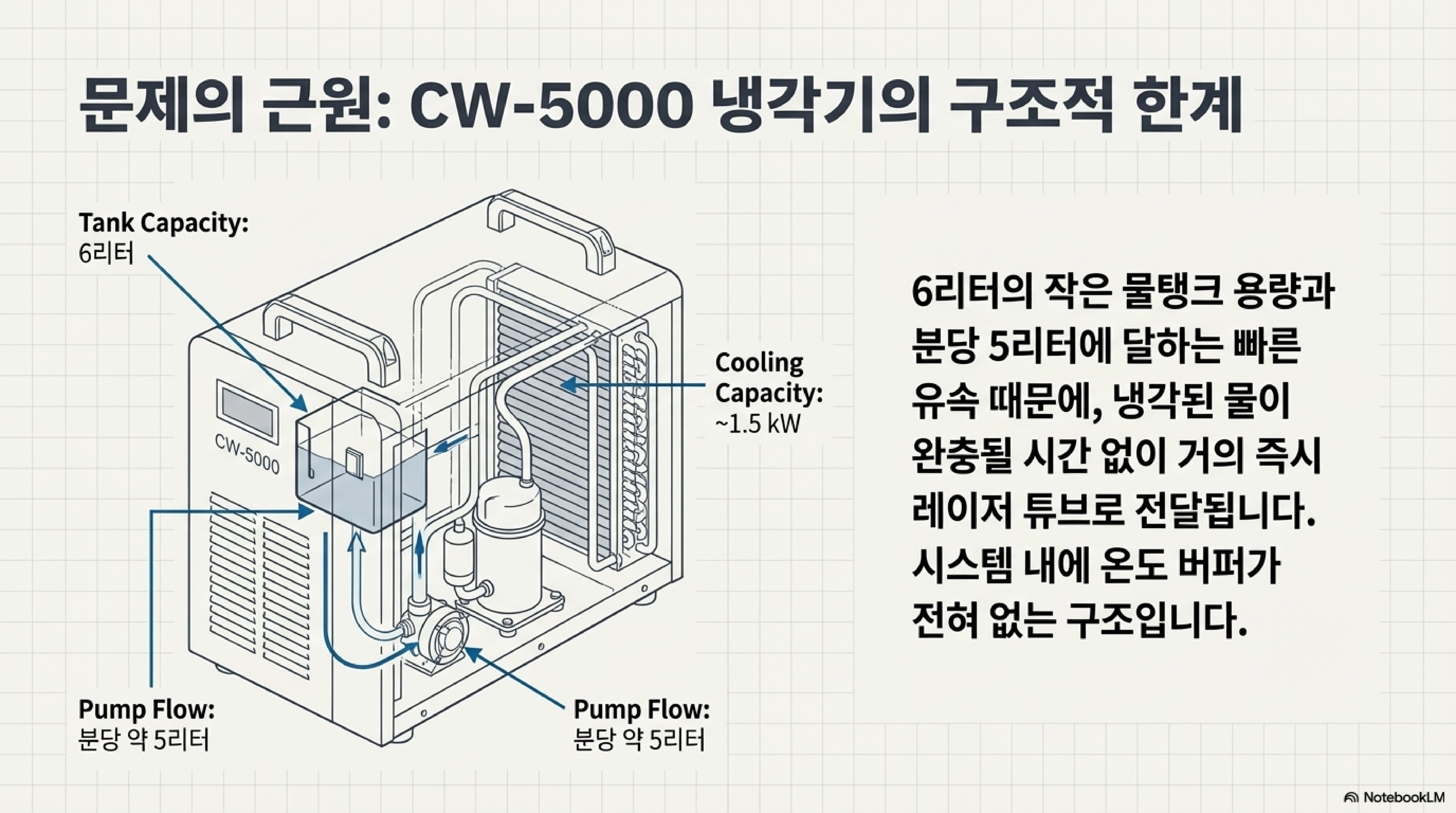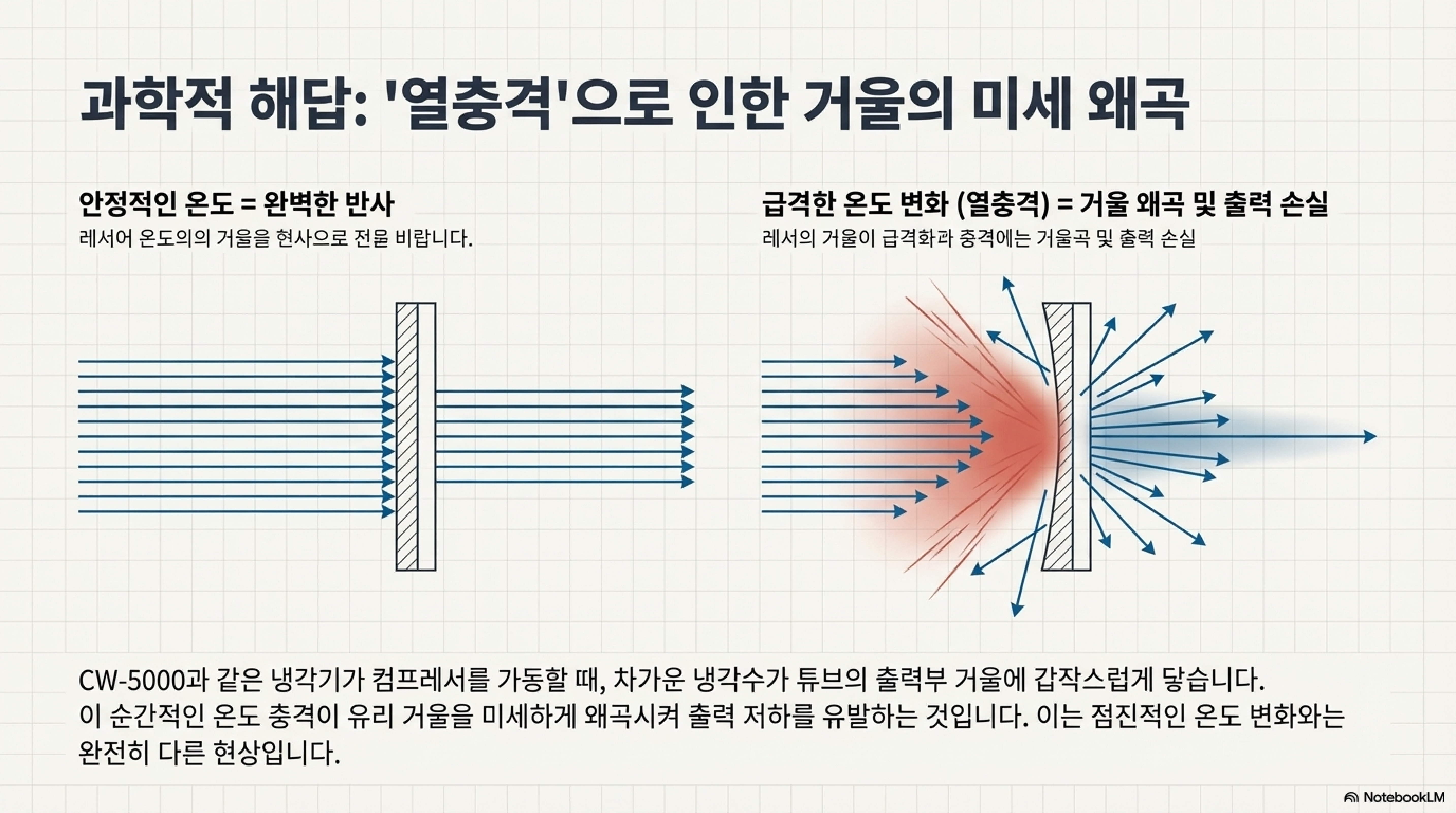 이 두 가지 특성이 결합되면, 냉각 장치가 작동하는 순간 작은 용량의 물은 순식간에 차가워집니다. 그리고 이 차가워진 물은 아무런 완충(buffering) 과정 없이 즉시 레이저 튜브로 보내집니다. 이것이 바로 미러에 치명적인 열충격을 가하는 직접적인 원인입니다.