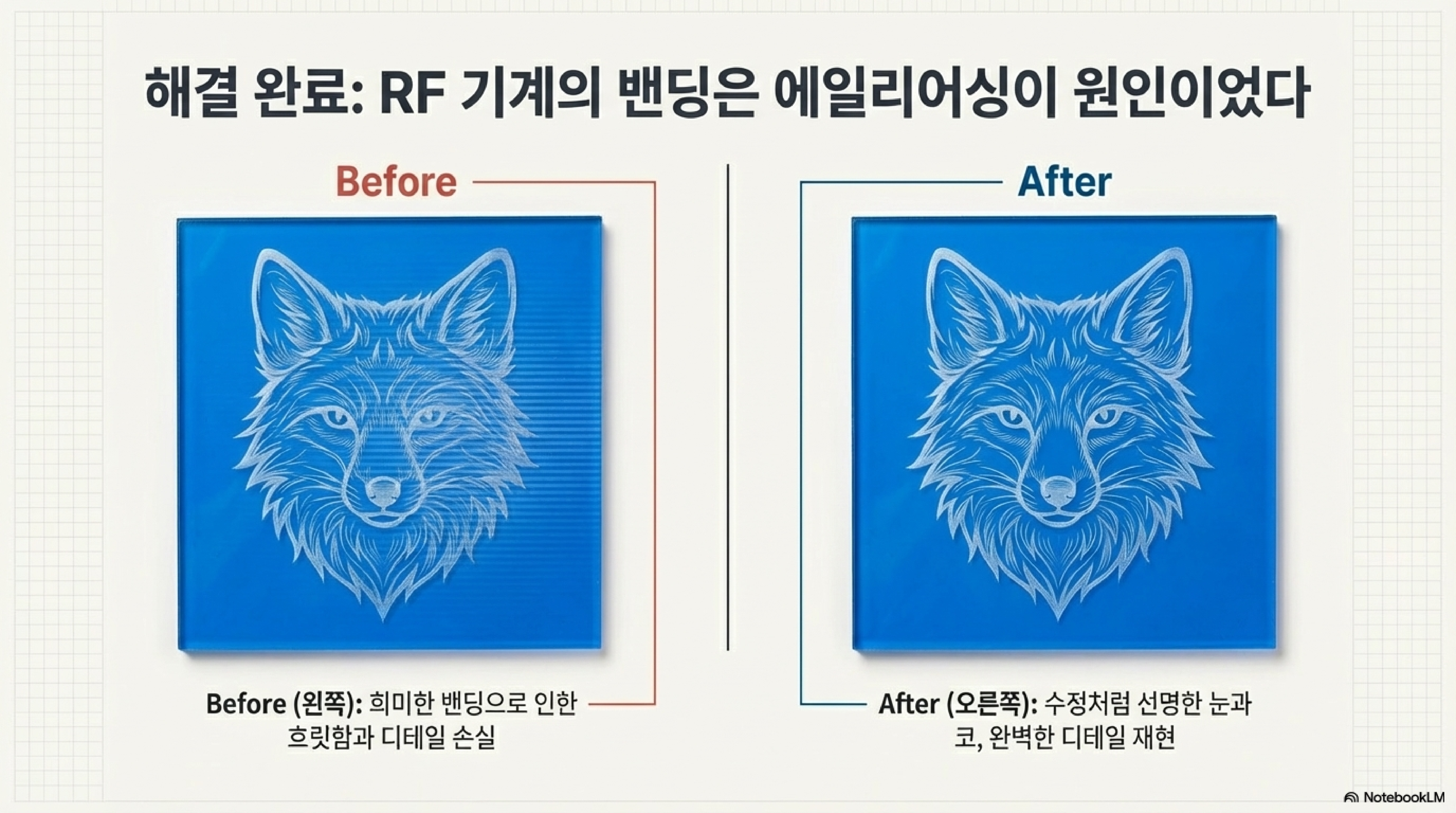 RF(고주파) 레이저를 사용하다 보면, 특히 균일한 표면을 각인할 때 미세한 물결무늬나 줄무늬가 나타나는 '에일리어싱' 현상을 마주하게 됩니다. 이는 이미지의 픽셀을 처리하는 신호와 레이저를 켜고 끄는 PWM(펄스 폭 변조) 신호의 주파수가 아주 약간 어긋날 때 발생하는 시각적 패턴입니다.