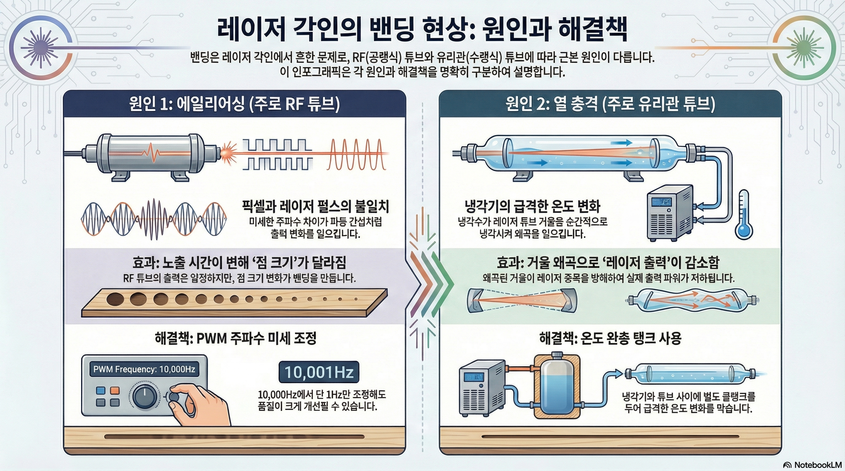 이 현상은 RF 레이저의 독특한 작동 방식 때문에 발생합니다. 주파수의 미세한 불일치는 레이저의 출력(Power)을 바꾸는 것이 아니라, 각 도트(dot)에 레이저가 노출되는 '노출 시간(exposure time)'을 미세하게 변화시킵니다. 이 미세한 노출 시간의 차이가 도트의 크기를 주기적으로 바꾸고, 이 작은 변화들이 모여 우리 눈에는 거대한 밴딩 패턴으로 보이게 되는 것입니다. 이것이 중요한 발견인 이유는, 사용자가 아무리 컨트롤러에서 출력(Power) 설정을 백분율로 정밀하게 조정하더라도, 근본적으로 다른 메커니즘인 '시간'이 결과물을 왜곡시키고 있었기 때문입니다. 이는 문제 해결의 접근법을 완전히 바꿔야 함을 의미합니다.