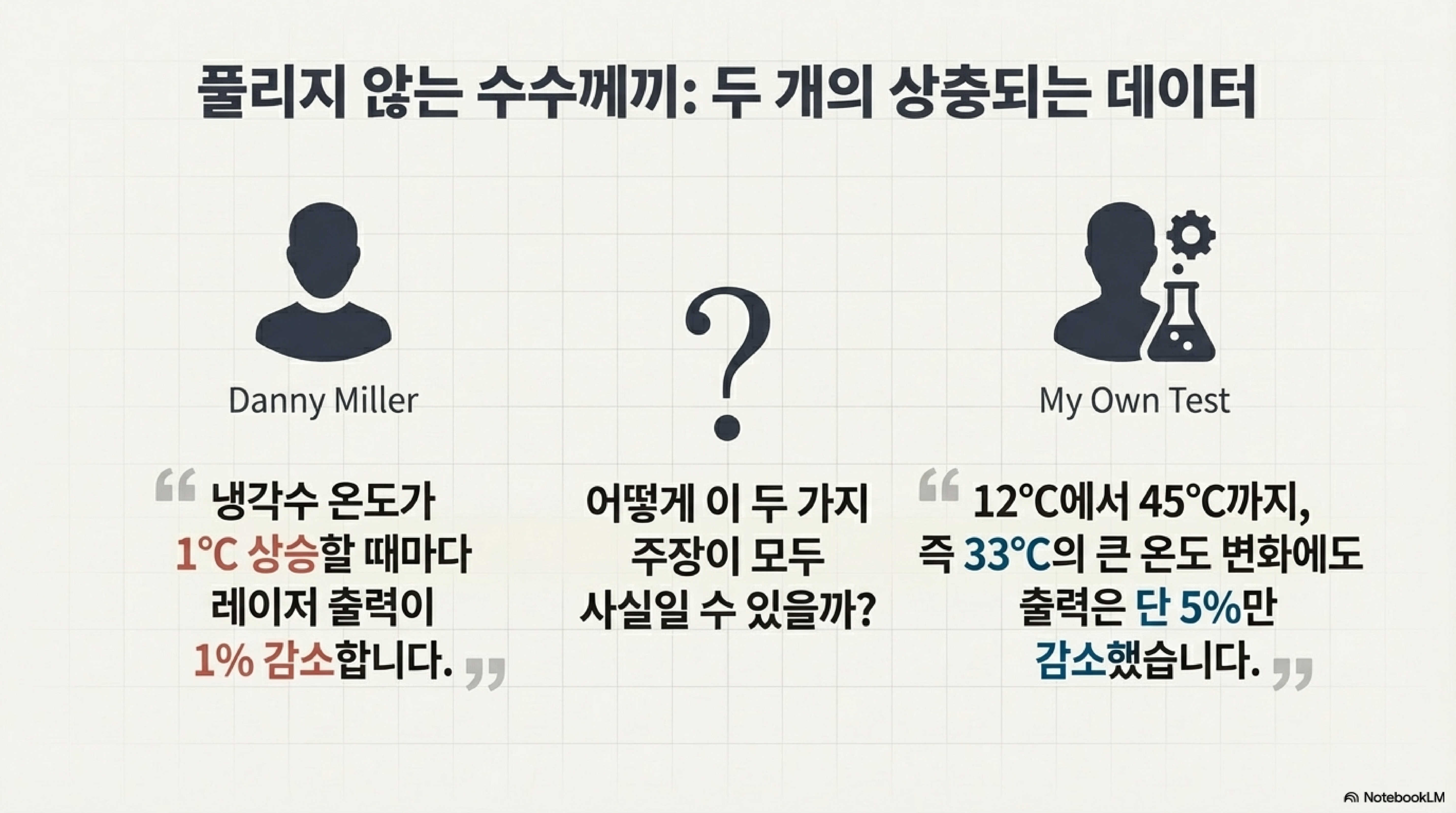 수년간 레이저 사용자들은 두 가지 상반된 데이터 때문에 혼란을 겪어왔습니다. 한편에서는 저의 실험 결과처럼 12°C에서 45°C까지, 무려 33°C에 달하는 큰 온도 변화에도 출력 손실은 5%에 불과했습니다. 다른 한편에서는 대니 밀러와 같은 숙련된 사용자들이 단 1°C의 변화가 1%의 출력 손실을 일으킨다고 주장했습니다. 어떻게 둘 다 사실일 수 있을까요? 해답은 물의 '온도'가 아니라, 온도 변화의 '속도'에 있었습니다.