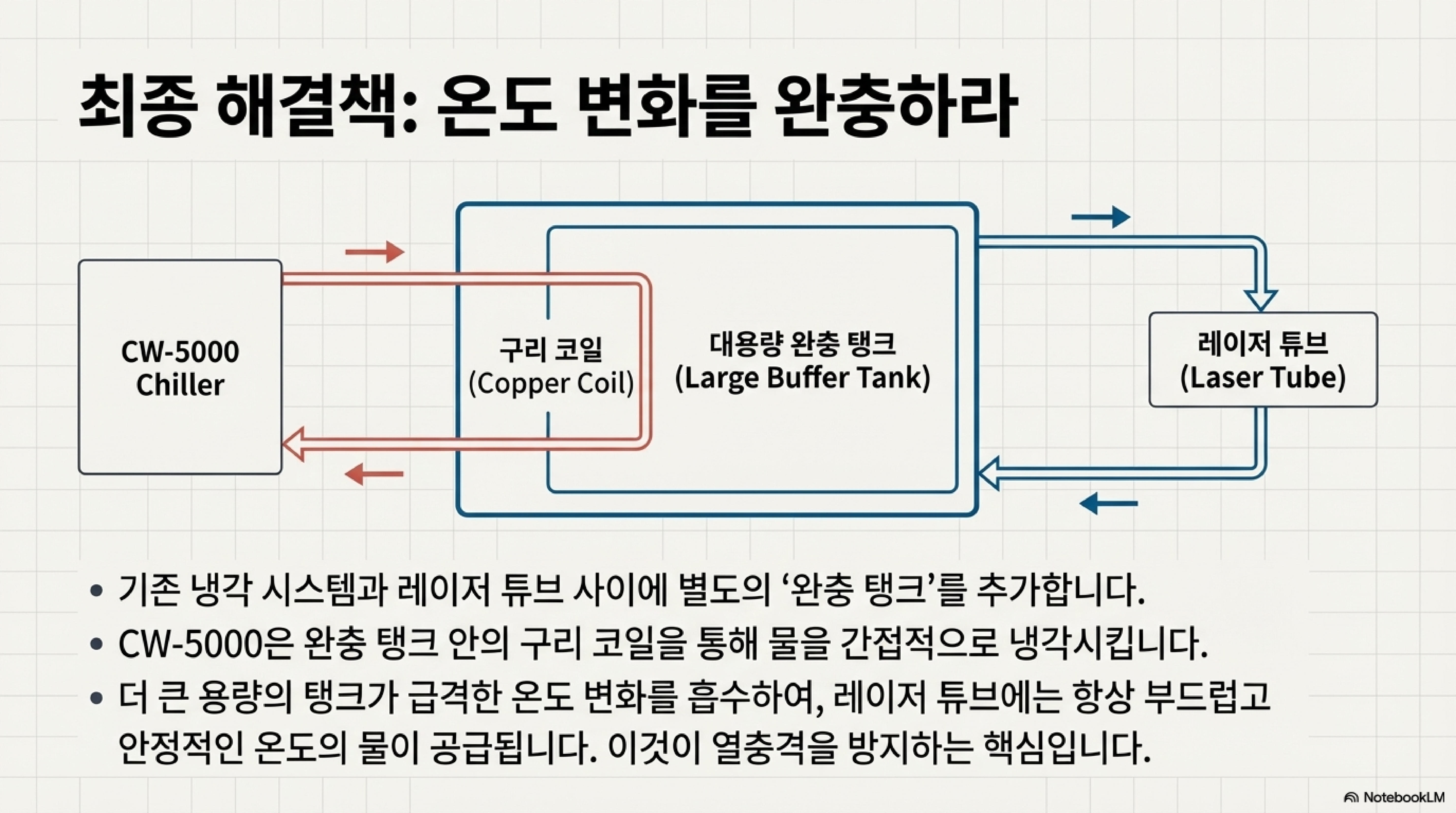 이 문제에 대한 근본적인 해결책은 냉각기와 레이저 튜브 사이에 별도의 '완충 물탱크(buffer tank)'를 추가하는 것입니다. 완충 탱크는 냉각기가 만든 급격한 온도 변화를 부드럽게 완화시켜, 레이저 튜브에는 안정적인 온도의 물이 공급되도록 합니다. 놀랍게도 이 해결책은 수년 전 미국의 레이저 유저들이 경험을 통해 발견했던 방법과 정확히 일치하며, 그 신뢰성을 더해줍니다.