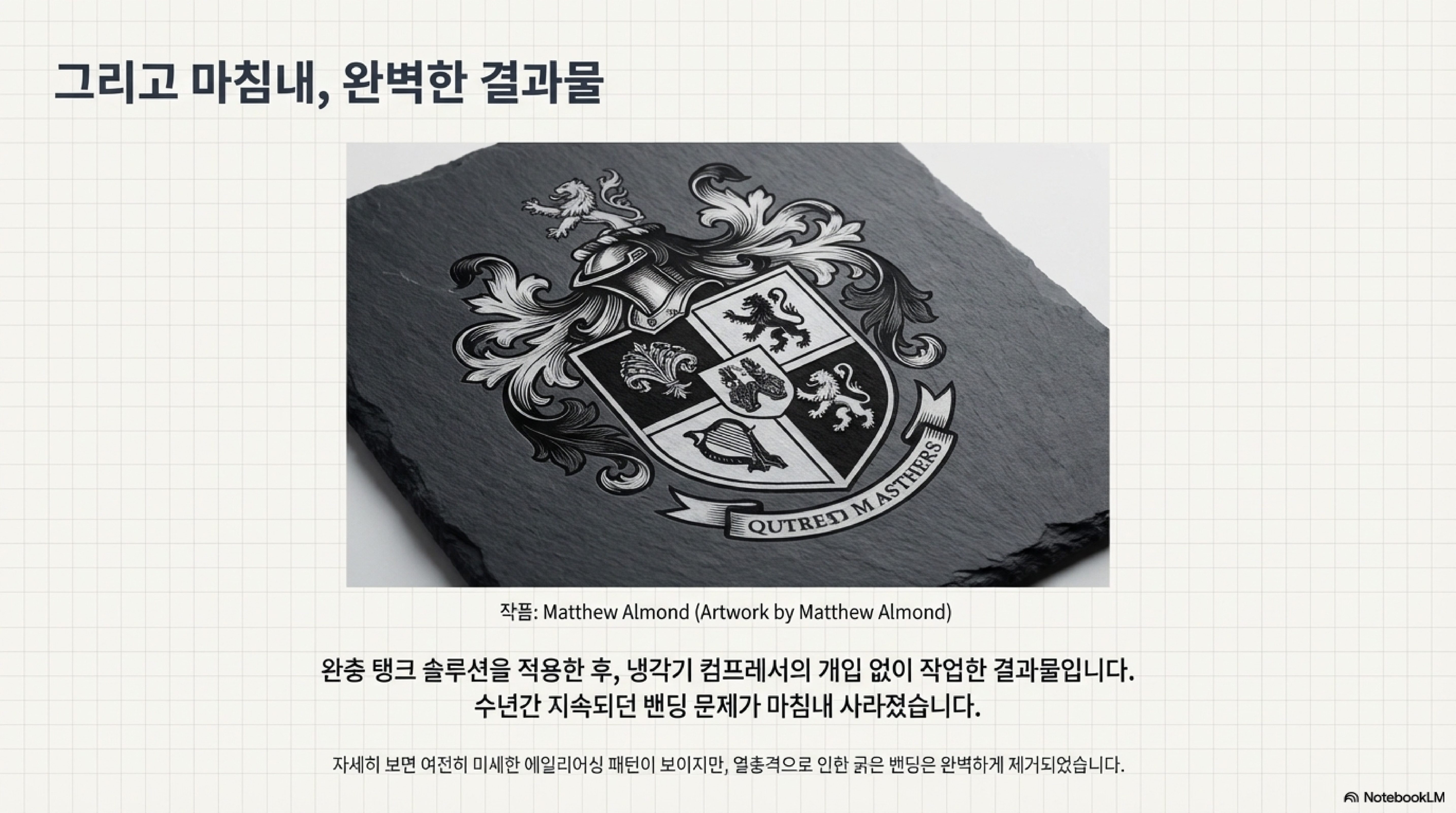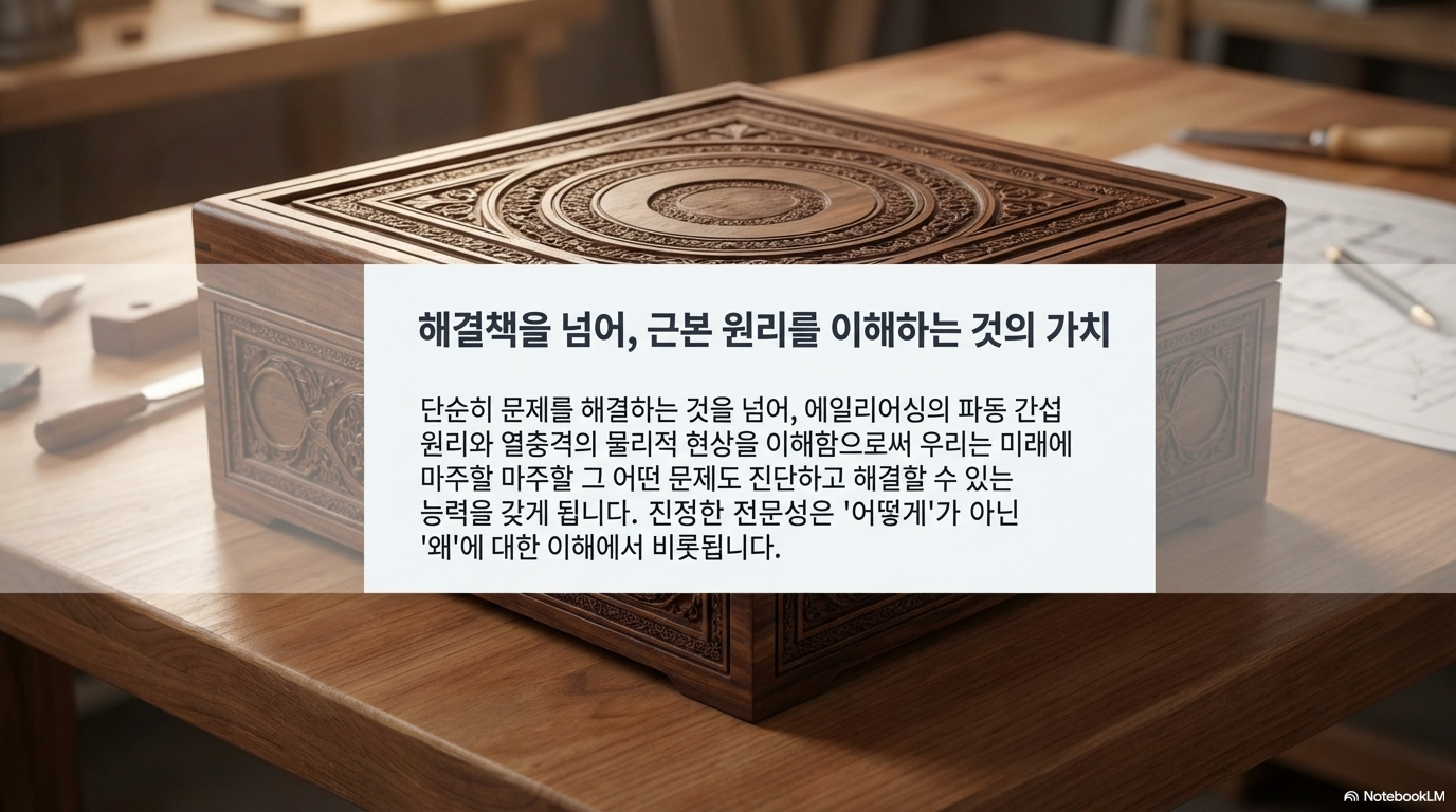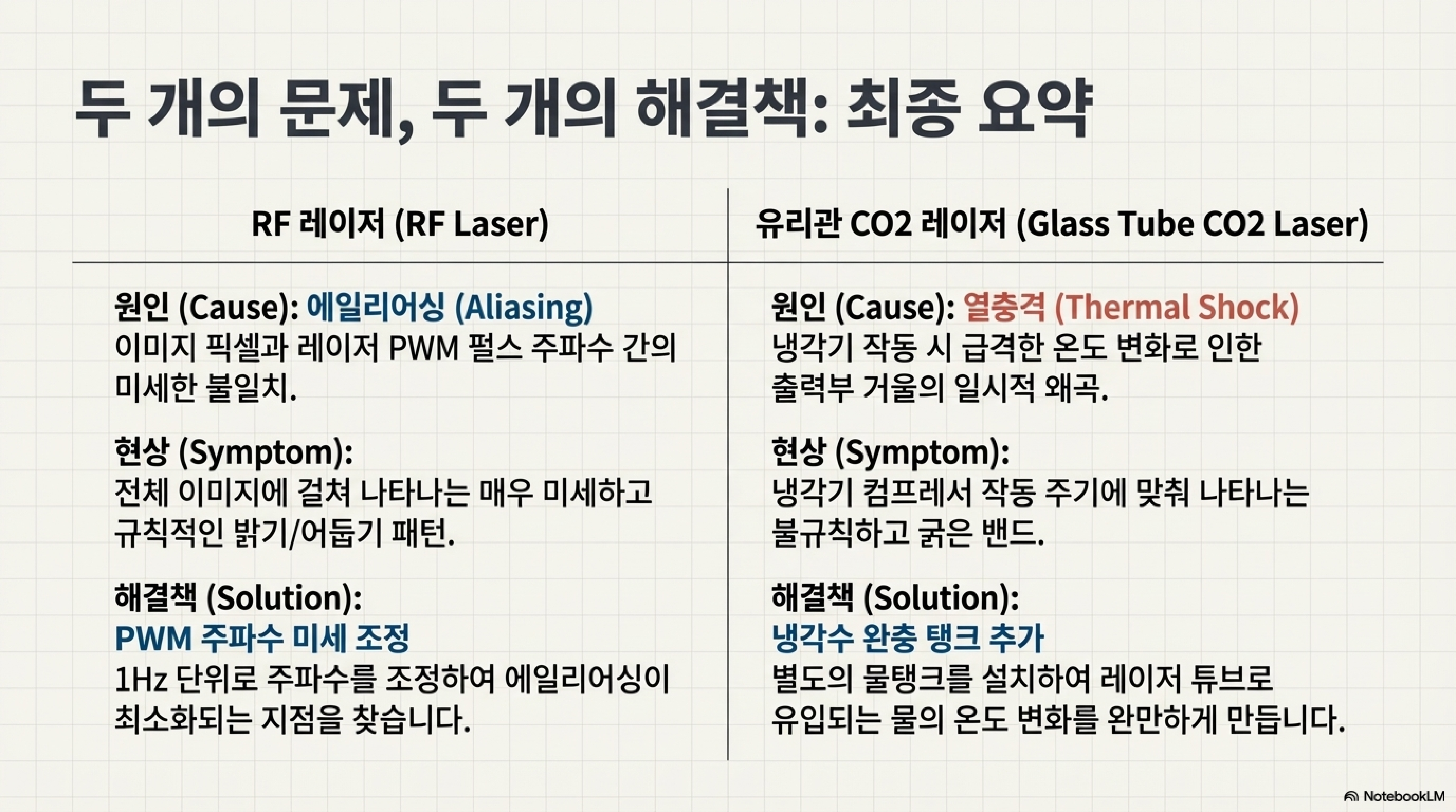 결론적으로, 완벽해 보이던 레이저 각인을 망치는 끔찍한 밴딩 현상은 우리가 흔히 들여다보는 속도나 파워 같은 큰 설정값에 있지 않았습니다. 그 원인은 10,000분의 1에 불과한 1Hz의 주파수 차이, 그리고 눈에 보이지 않는 순간적인 온도 충격과 같은 극도로 미세한 요인들에 숨어 있었습니다. 이는 문제 해결을 위해 더 깊고 근본적인 원리를 이해해야 한다는 중요한 교훈을 줍니다.