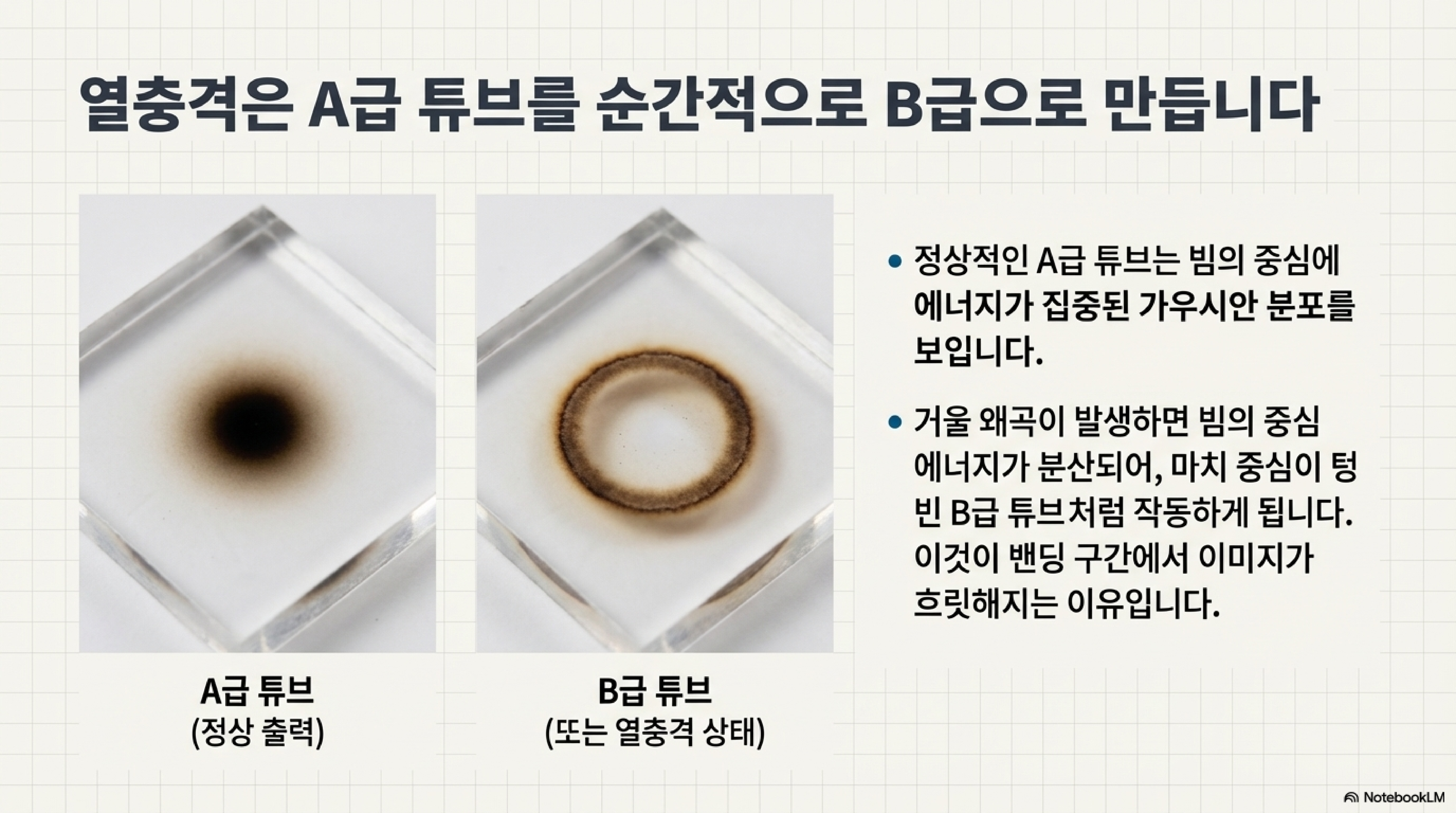 - 출력 저하: 완벽하게 평행을 유지해야 할 미러가 뒤틀리면서 레이저 빔의 내부 반사가 불안정해지고, 이는 순간적으로 상당한 출력 저하로 이어집니다.