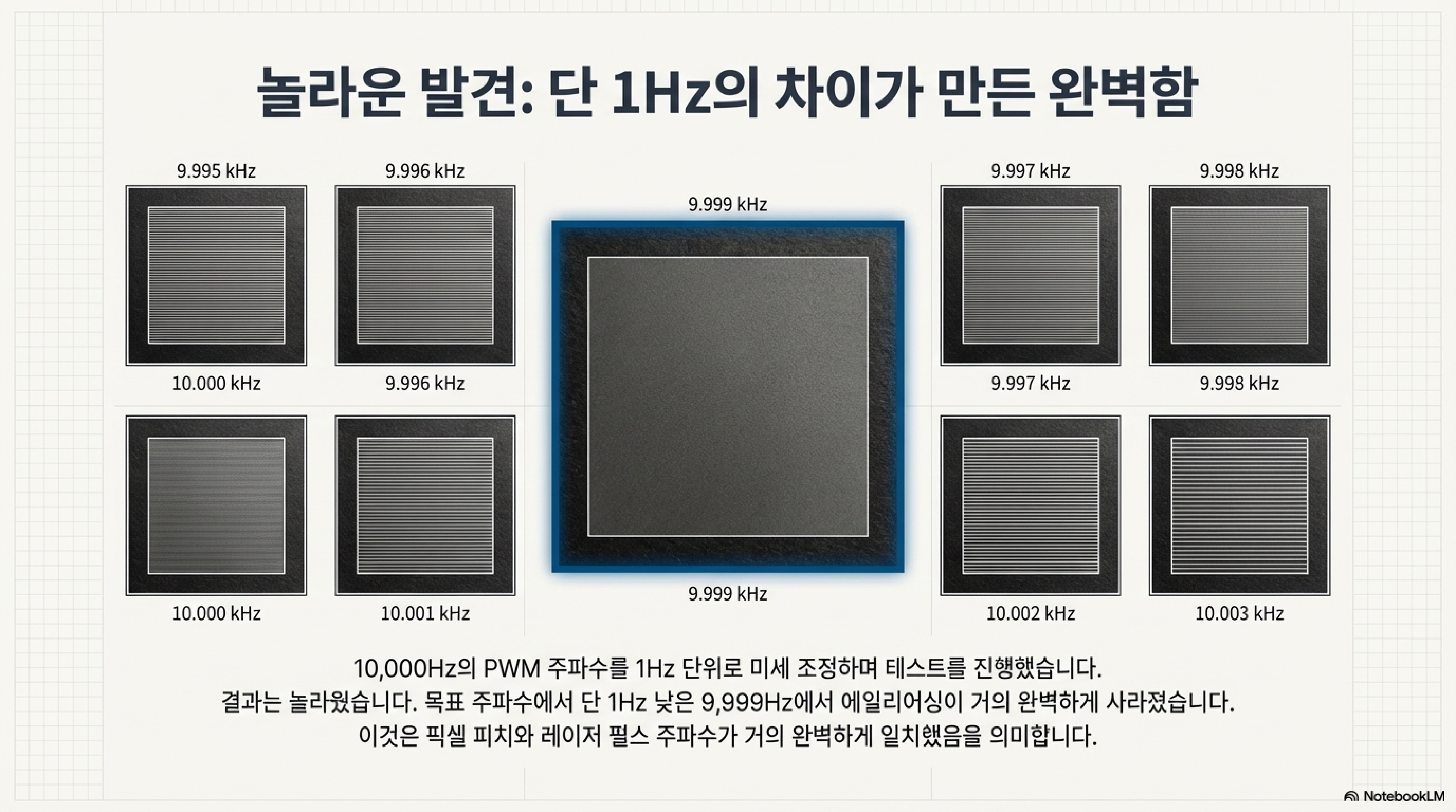이것은 마치 두 명의 드러머가 거의 똑같은 박자로 연주하지만, 한 명이 아주 미세하게 빨라서 매 분마다 한 번씩 박자가 완벽히 겹쳤다가 다시 서서히 어긋나는 것과 같습니다. 레이저에서도 픽셀 신호와 PWM 신호가 이렇게 미세하게 어긋나면서, '박자가 맞는' 부분은 도트가 커지고 '어긋나는' 부분은 작아지는 현상이 주기적으로 반복되어 눈에 보이는 패턴을 만드는 것입니다.