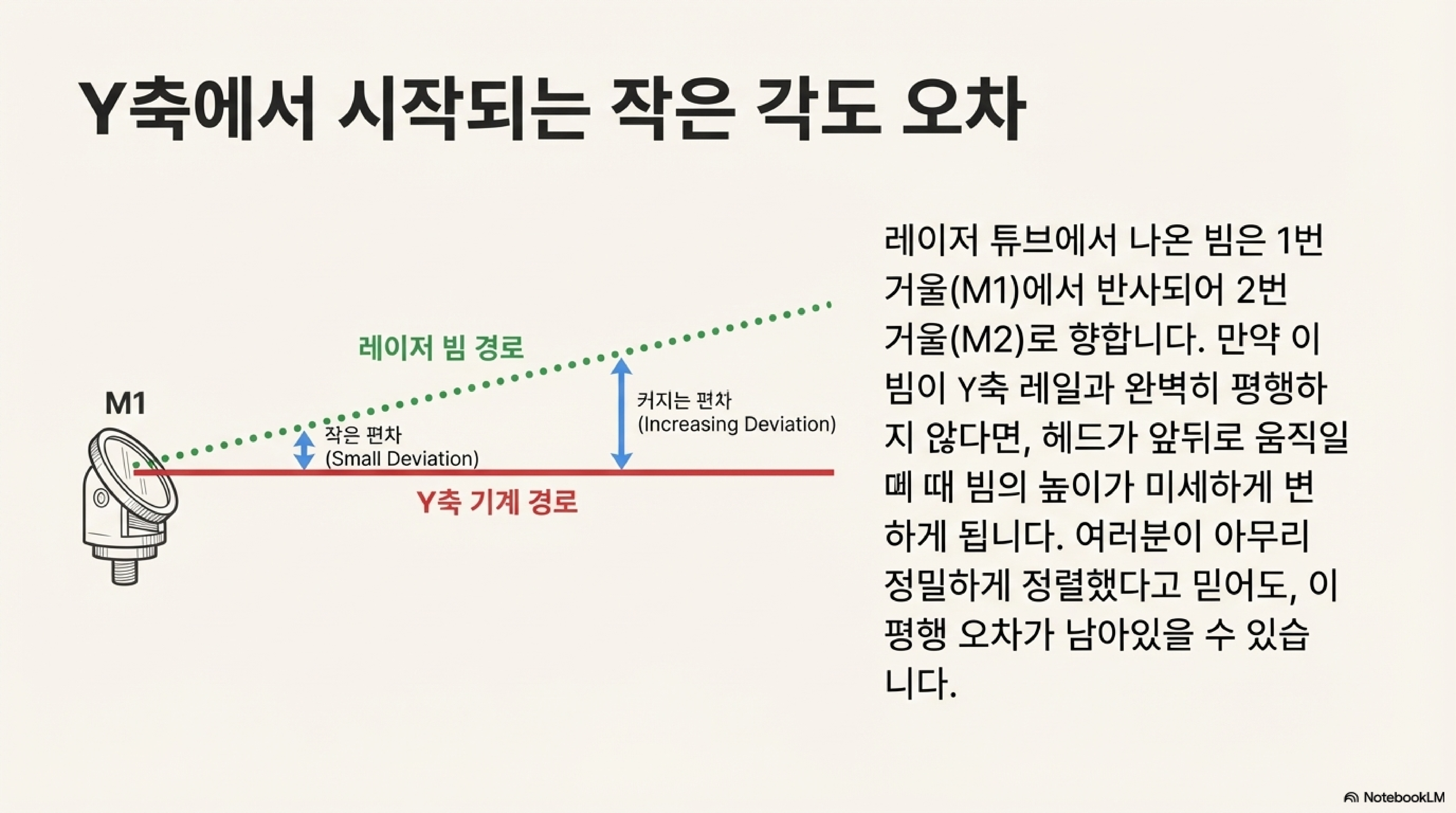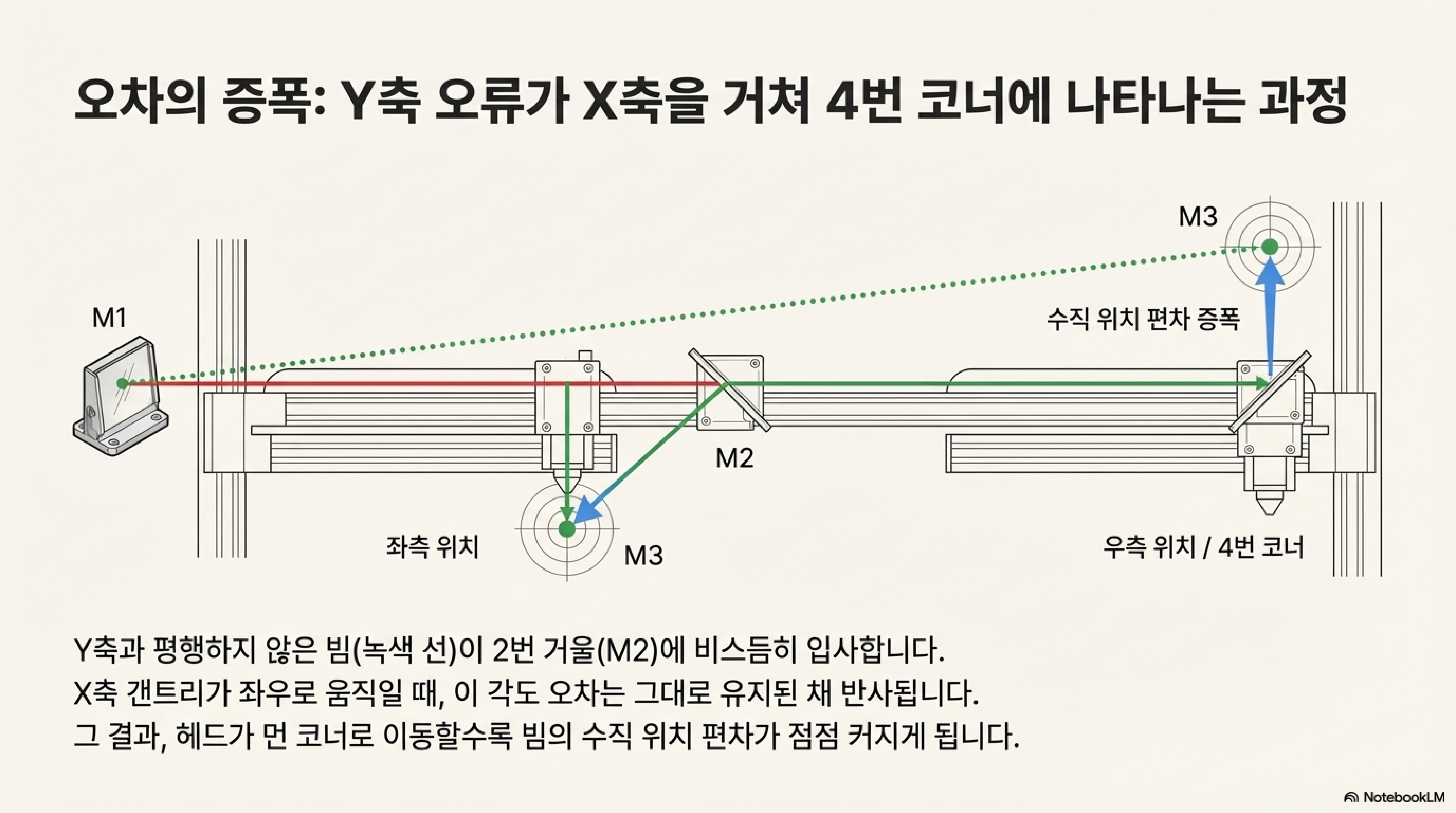이 미세한 각도 오류는 빔이 두 번째 거울(Mirror 2)에서 반사될 때 증폭됩니다. 갠트리가 Y축을 따라 기계 앞쪽으로 이동하는 동안, 이 각도 때문에 빔은 세 번째 거울(Mirror 3)의 표면을 따라 미세하게 위나 아래로 '걸어가게' 됩니다. 가까운 거리에서는 이 변화가 거의 보이지 않지만, 갠트리가 작업 영역 끝(네 번째 모서리)까지의 긴 거리를 이동하면 이 작은 '걸음'들이 쌓여 눈에 띄는 큰 오차를 만들어내는 것입니다.