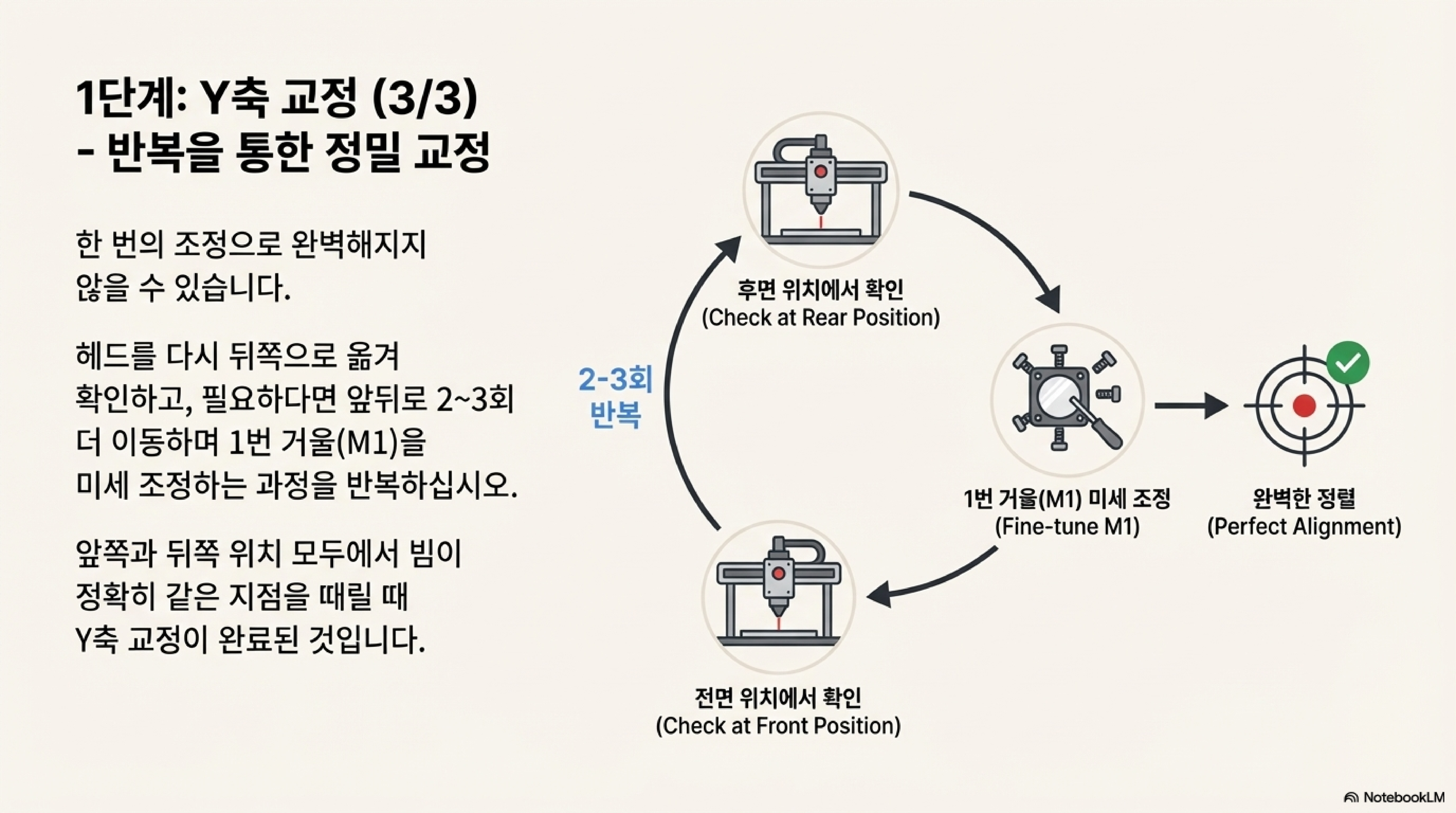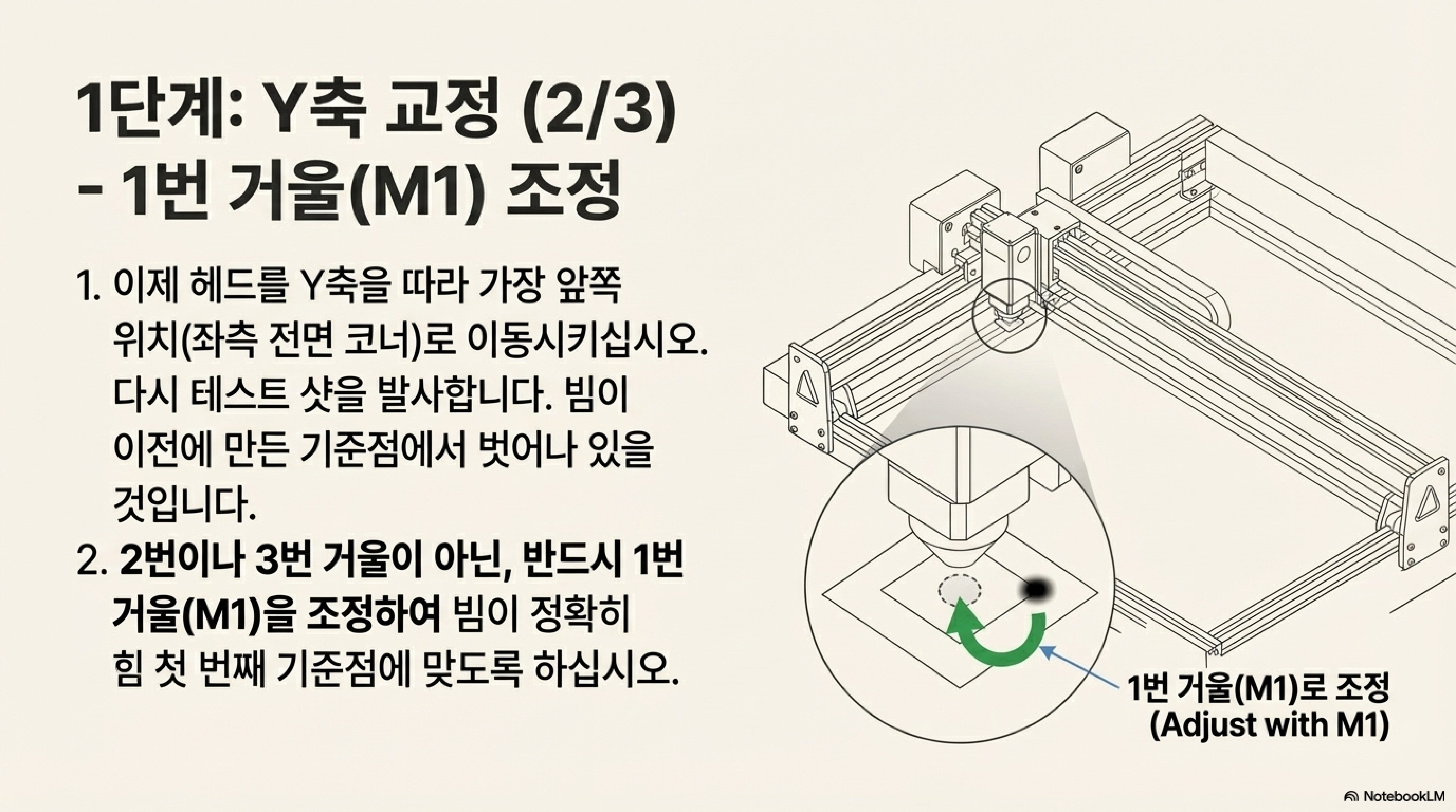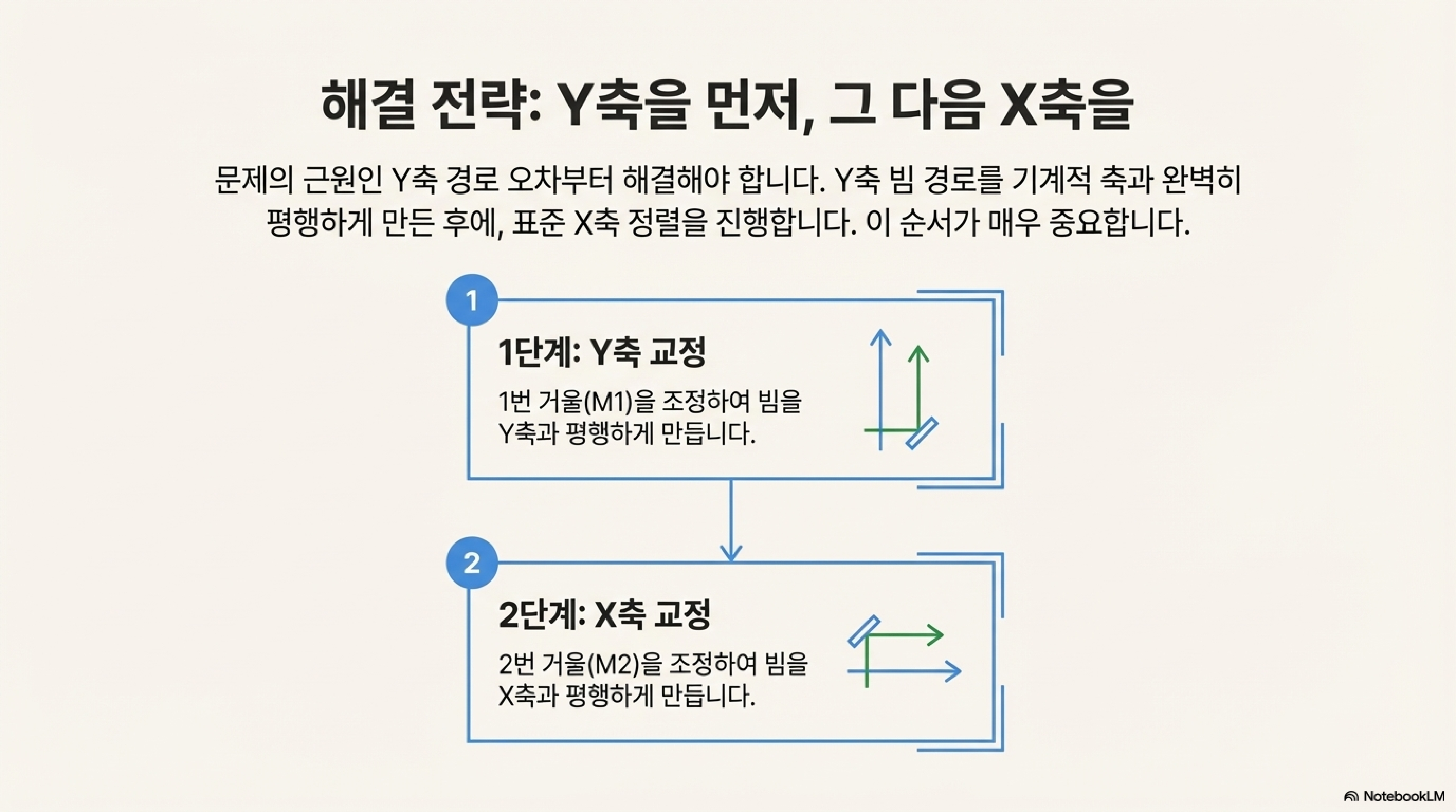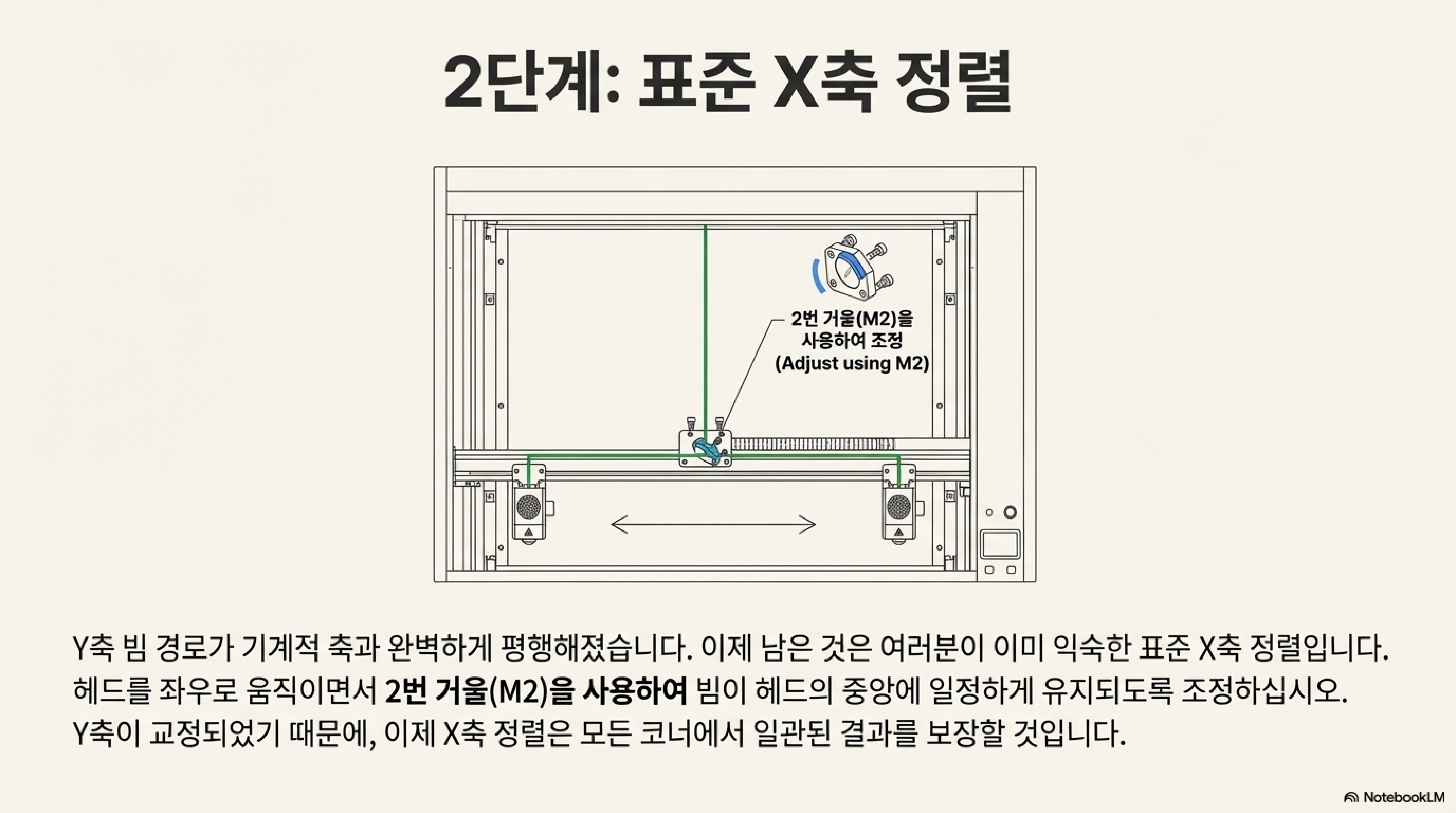 - 2단계: X축 경로 재정렬 (2번 거울 조정): 1번 거울 조정을 통해 Y축 경로를 바로잡으면 기존의 X축 정렬은 틀어지게 됩니다. 이제는 표준적인 X축 정렬 절차에 따라, 헤드를 좌우로 움직이면서 2번 거울(Mirror 2)을 조정하여 X축 경로를 완벽하게 보정합니다.