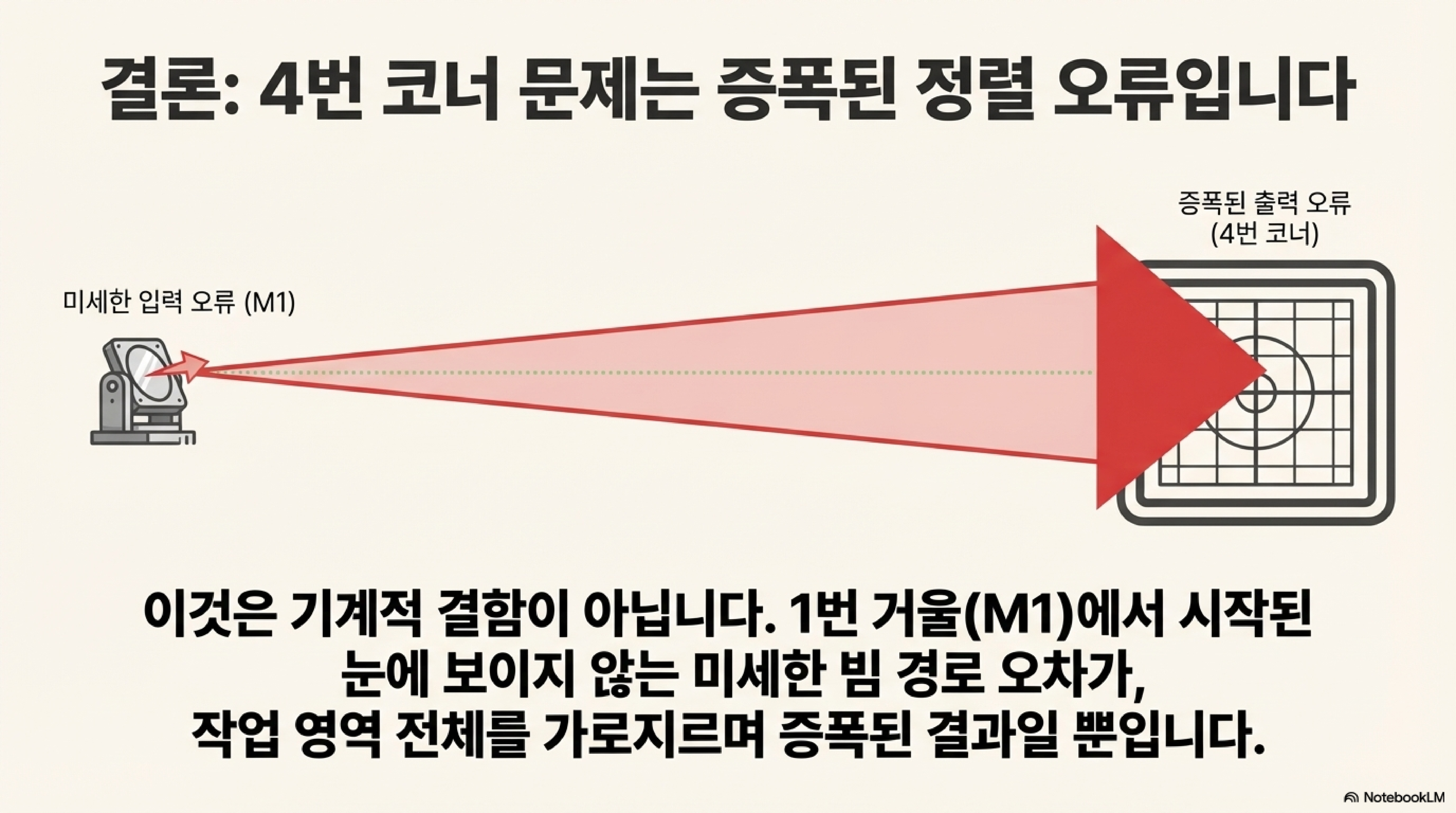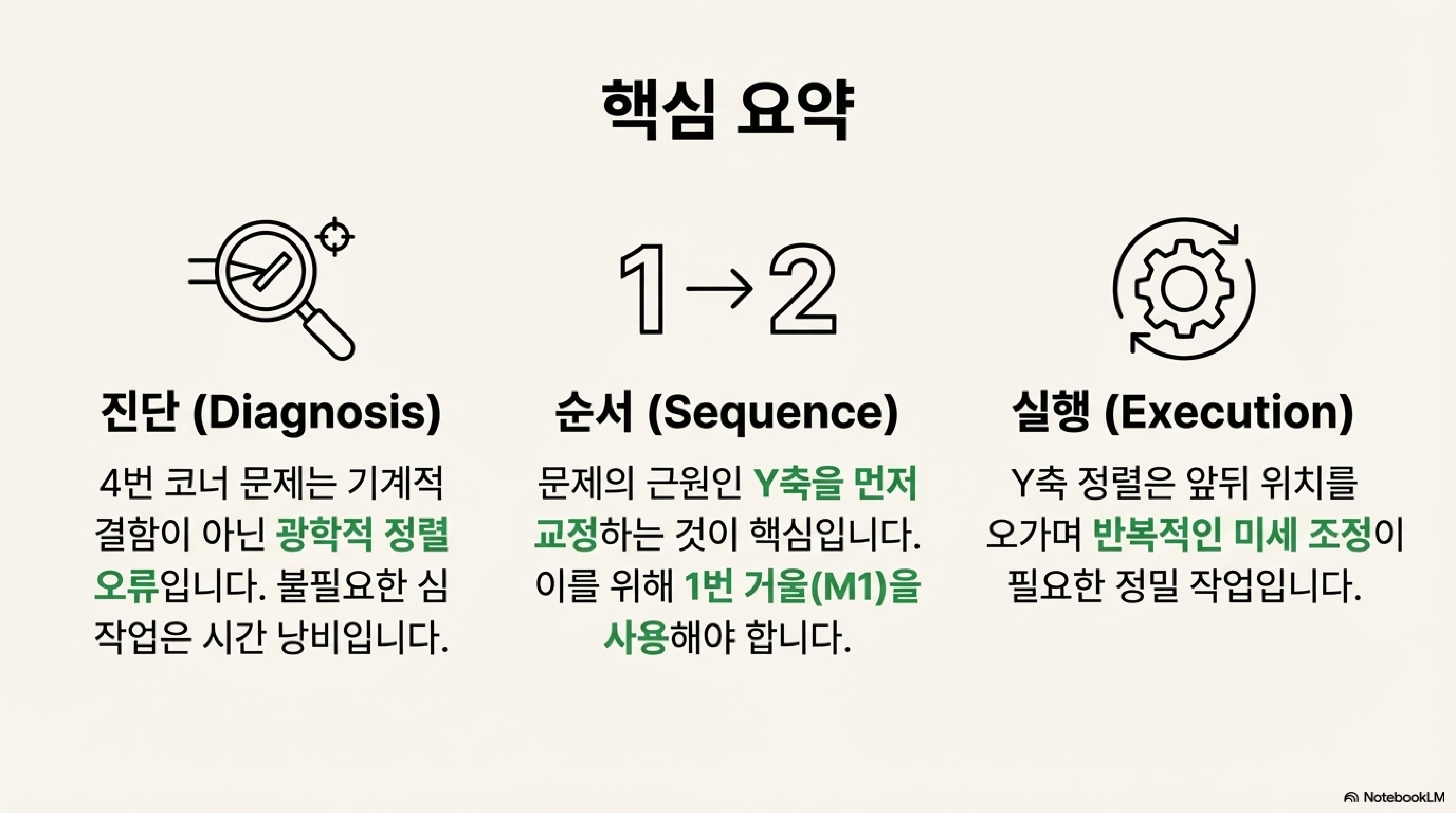 결론적으로, '네 번째 모서리 문제'는 기계적 결함의 신호가 아니라 미세한 정렬 오류가 광학적으로 증폭되어 나타나는 현상입니다. 복잡해 보이는 문제도 올바른 진단과 정확한 절차를 이해하면 의외로 간단하게 해결할 수 있습니다.