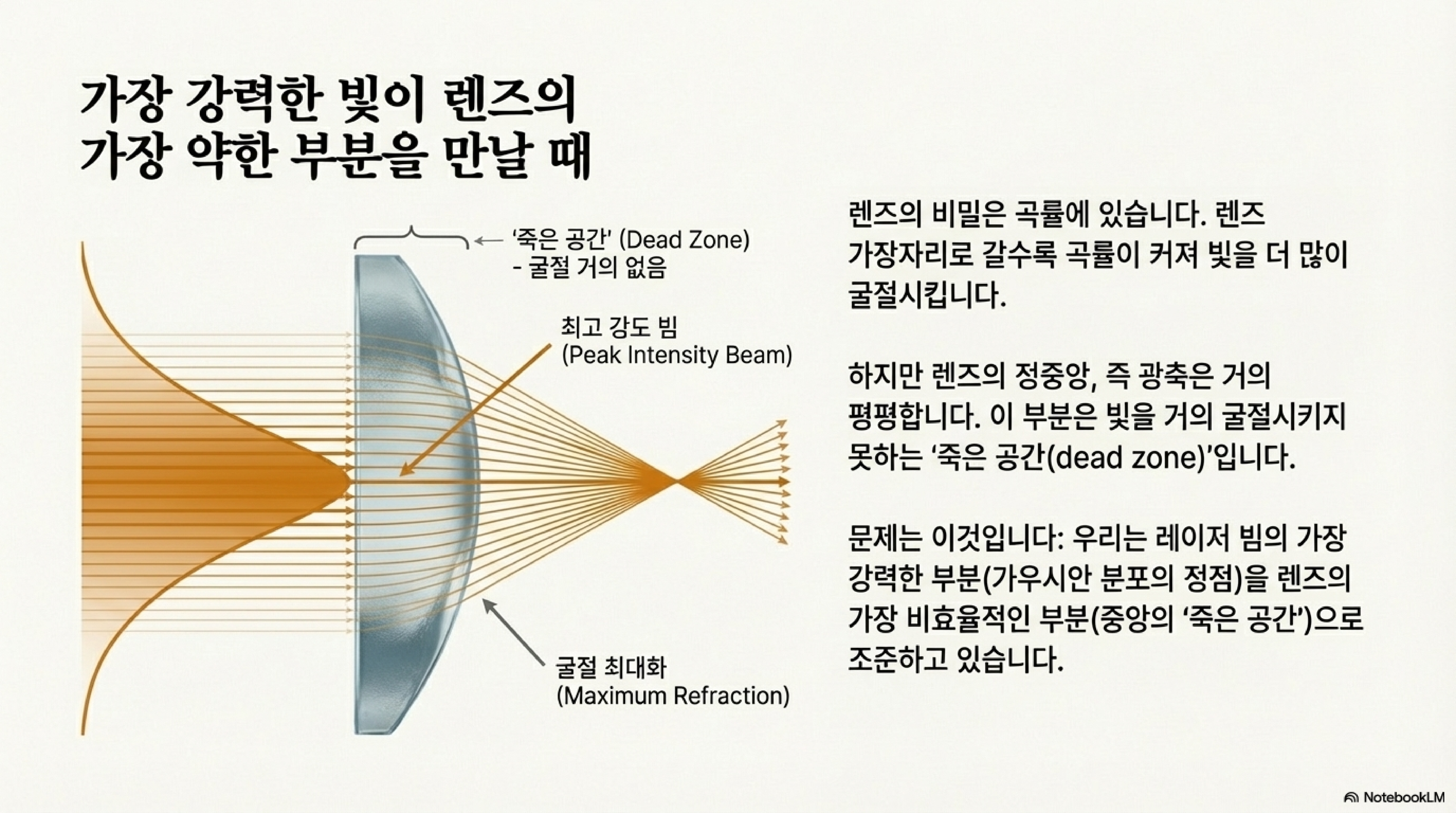 이것이 바로 앞서 제시된 문제의 핵심입니다. 레이저의 가장 강력한 부분(가우시안 분포의 중심)이 렌즈의 가장 비효율적인 부분(초점 능력이 없는 중심)을 통과하기 때문에 고전 광학 이론으로는 그 결과를 예측할 수 없습니다. 빔의 가장 강렬한 에너지가 효과적으로 집중되지 못하는 현상이 발생하는 것입니다.