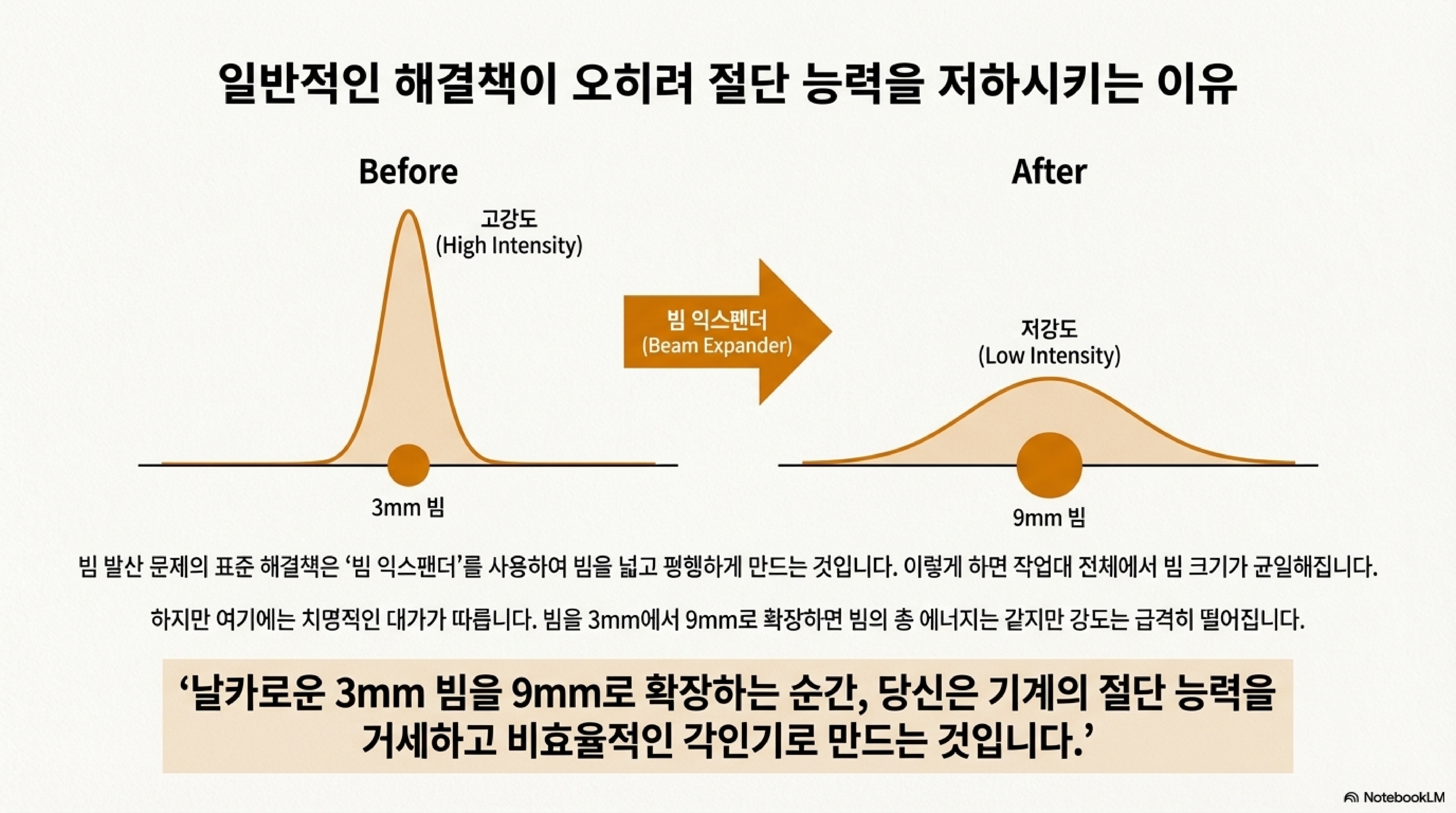 레이저 빔의 에너지는 햇빛처럼 균일하지 않습니다. '가우시안 분포'라는 특성 때문에 빔의 중심부에 에너지가 극도로 집중되고 가장자리로 갈수록 약해집니다. 이 강력한 중심 에너지를 넓게 퍼뜨리는 것은 절단 능력에 치명적입니다.