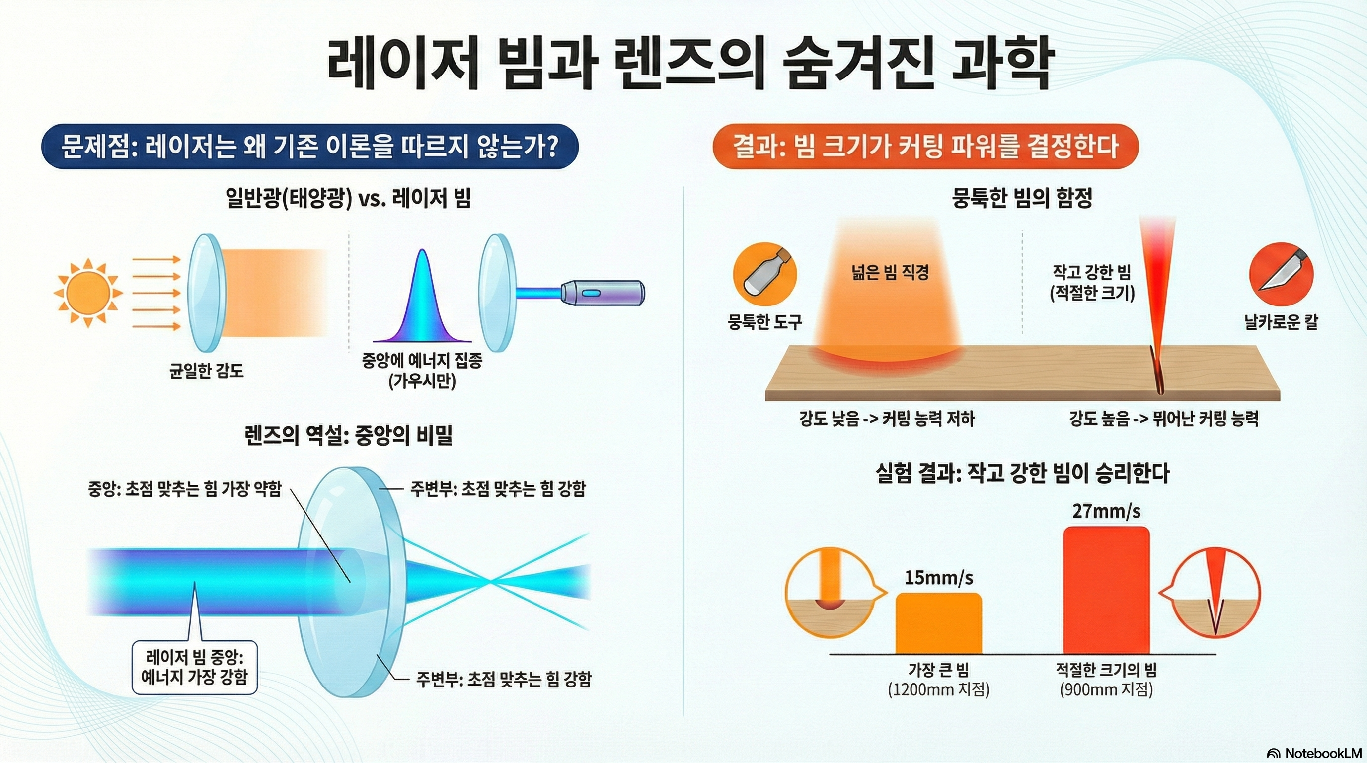 어릴 적 돋보기로 햇빛을 모아 종이를 태워본 경험, 다들 한 번쯤 있으실 겁니다. 강렬한 태양 광선이 렌즈를 통과해 작고 뜨거운 한 점으로 모이는 모습은 광학의 기본 원리처럼 보입니다. 하지만 레이저라는 특수한 빛을 만나는 순간, 이 익숙한 상식은 근본부터 흔들리기 시작합니다.