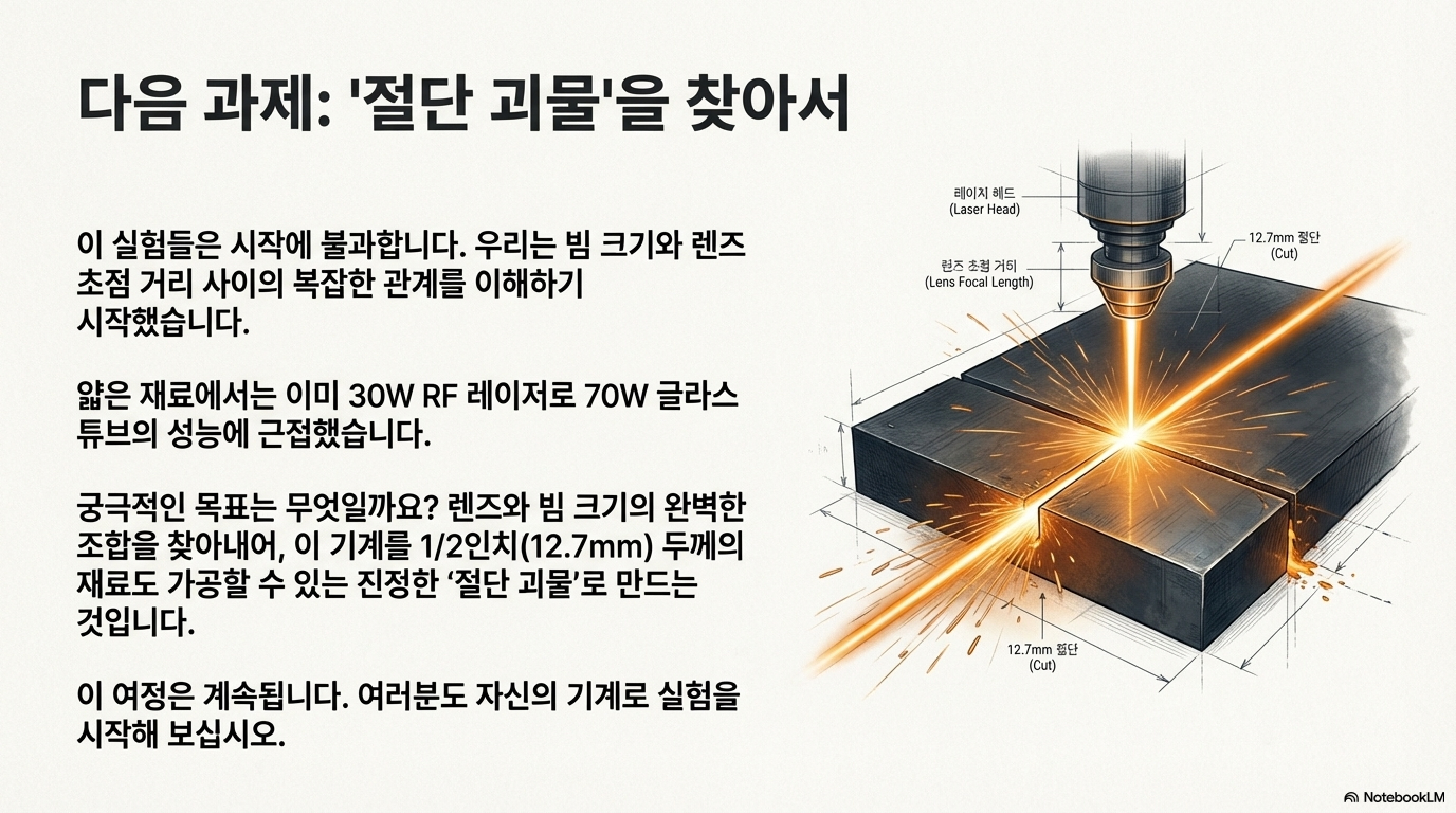 필자의 여정은 빔의 형태를 최적화하는 것만으로도 기계의 숨겨진 성능을 끌어낼 수 있음을 명확히 보여줍니다. 30W 기계로 70W 기계의 성능에 근접한 지금, 그의 탐구는 여기서 멈추지 않습니다. 그의 꿈은 빔의 크기와 렌즈 초점 거리 사이의 완벽한 조합을 찾아내, 이 기계를 0.5인치(약 12mm) 두께의 재료도 거뜬히 잘라내는 '절단 괴물'로 만드는 것입니다. 우리의 작업장에 숨겨진 잠재력을 깨우기 위해, 또 어떤 상식을 의심해봐야 할까요?