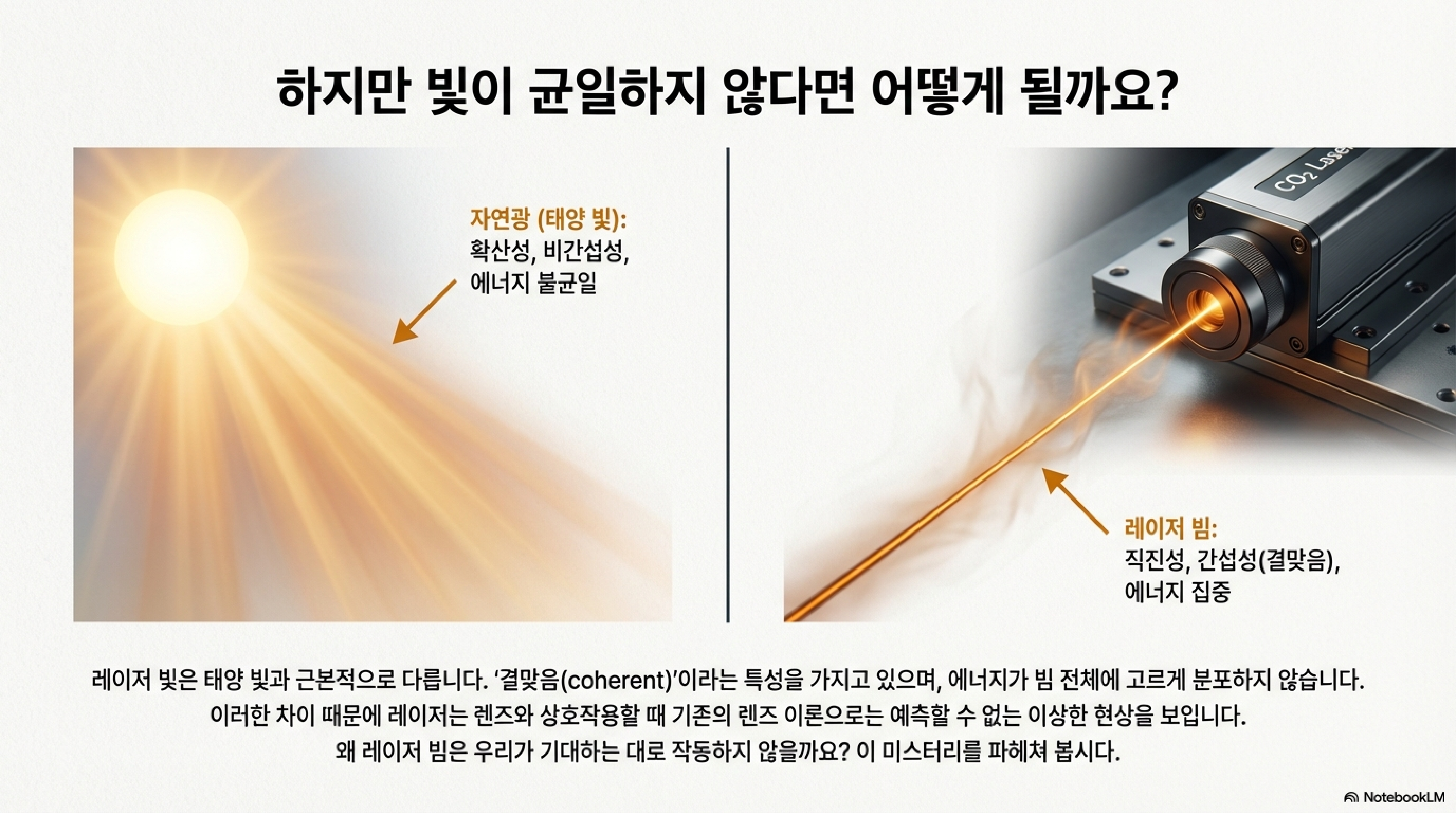 갈릴레오나 뉴턴과 같은 과학자들이 연구했던 고전 광학은 태양에서 오는 '균일한 광선'을 기반으로 합니다. 하지만 레이저는 이와 근본적으로 다른 '결맞는 빛(coherent light)'입니다.