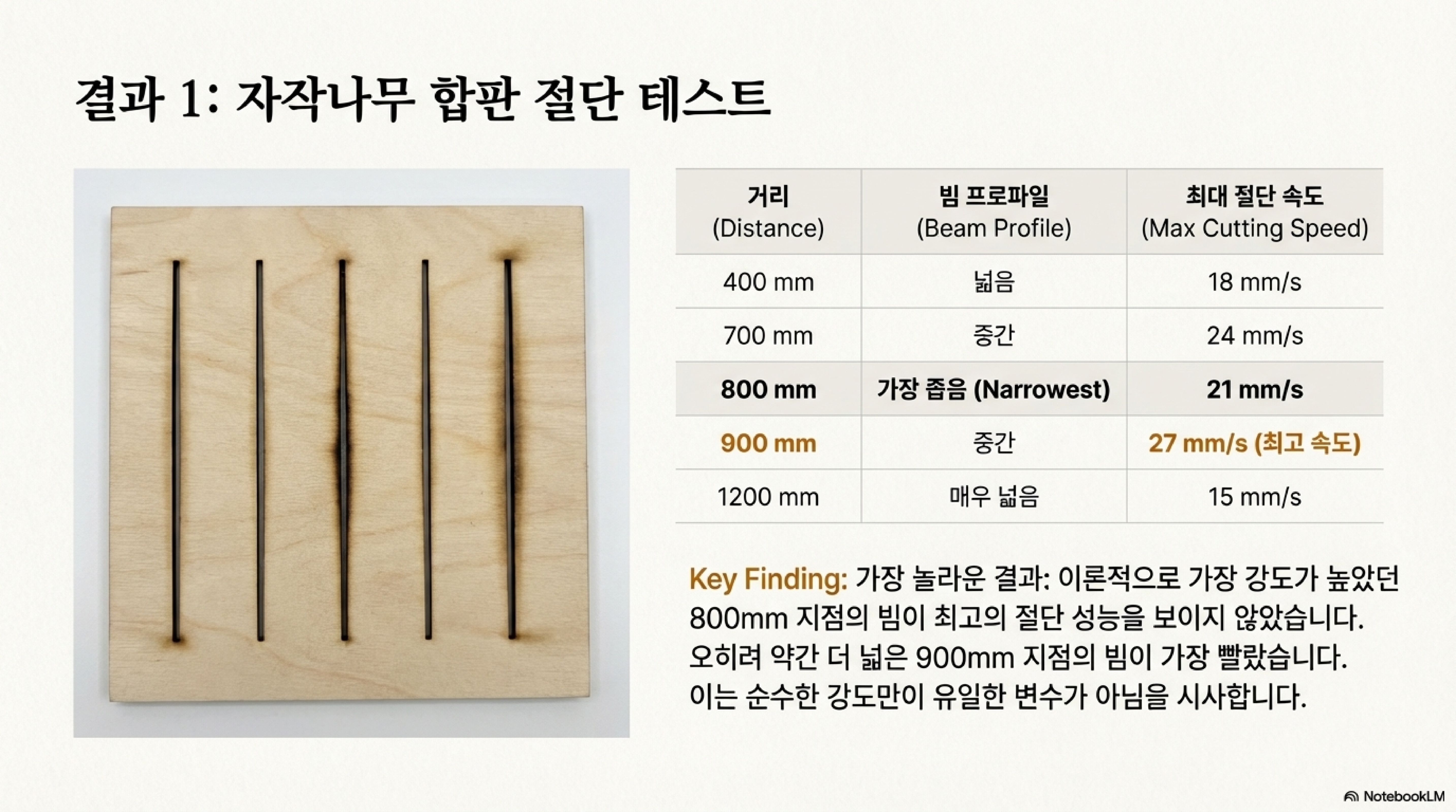이 수치는 그의 70W 유리관 레이저 절단 속도(35mm/s)에 근접하며, 일반적인 40W 유리관 레이저(15mm/s)의 성능을 훨씬 뛰어넘는 것입니다. 이는 단순히 와트(W) 수가 높은 것이 능사가 아님을 보여줍니다. '날카로운' 저출력 빔이 '무딘' 고출력 빔보다 훨씬 효율적일 수 있으며, 빔의 품질(작은 직경에 높은 강도)이 총출력보다 더 중요할 수 있다는 사실을 증명합니다.