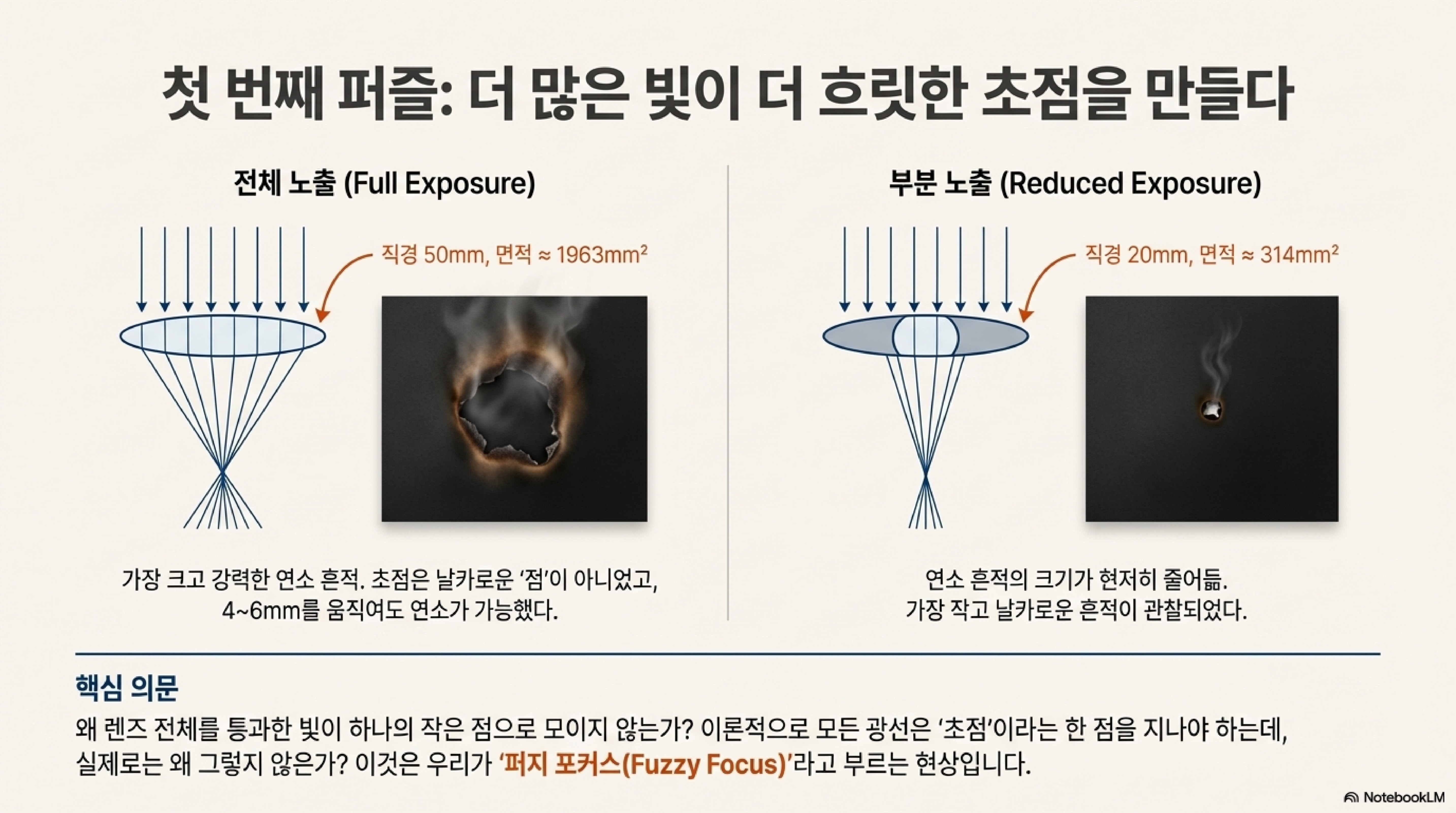 우리는 흔히 렌즈가 만들어내는 '스팟 사이즈'가 고정된 값이라고 생각하지만, 이는 오해입니다. 저의 번 테스트(burn test) 결과는 스팟 사이즈가 정적인 개념이 아니라는 것을 명확히 보여주었습니다.