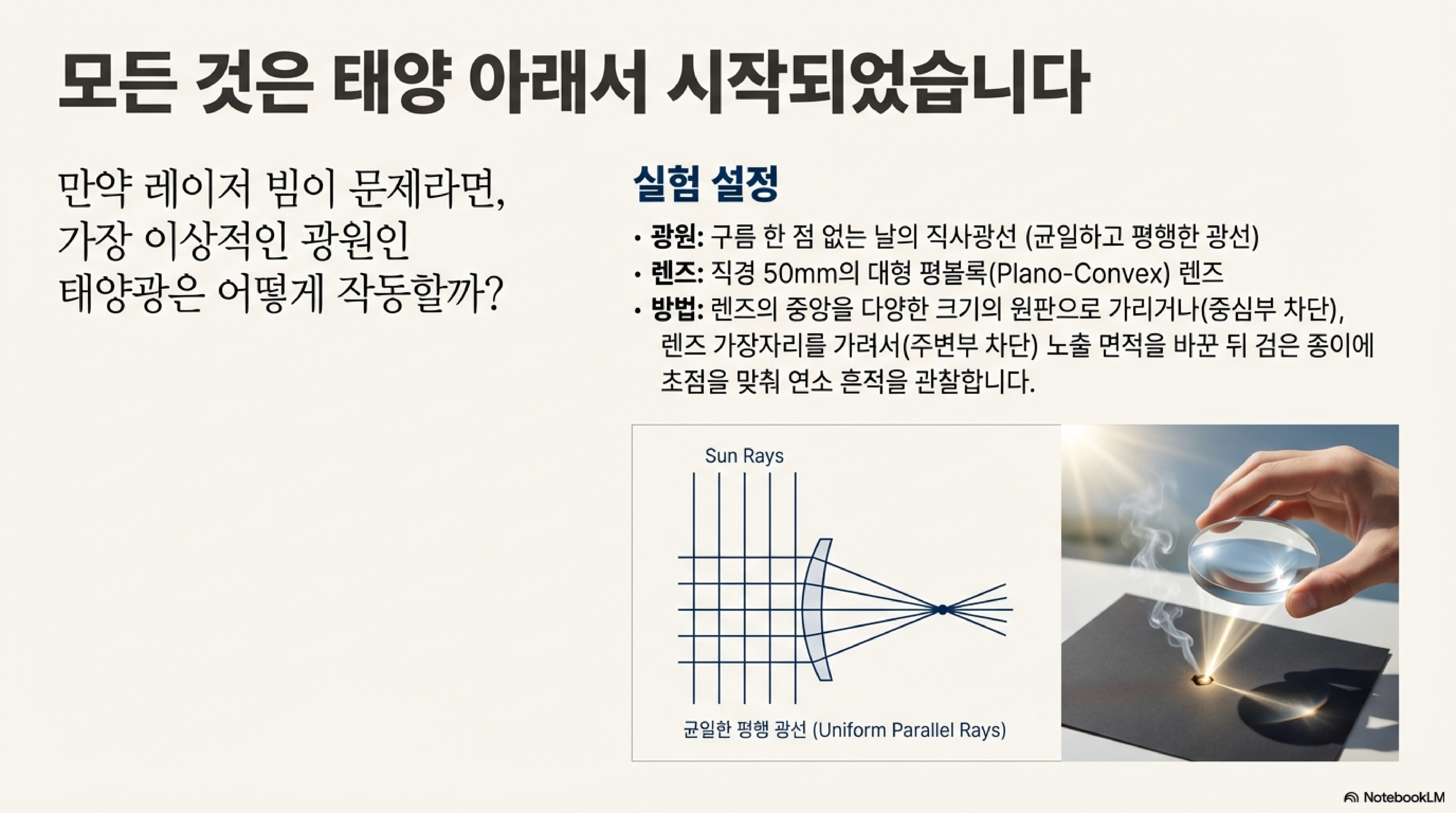 우리는 어릴 적 돋보기를 햇빛 아래에 두고 검은 종이 위에 빛을 모아 불을 붙이는 놀이를 해본 경험이 있습니다. 이 경험을 통해 우리는 렌즈가 빛을 완벽하고 작은 한 점으로 모아준다고 자연스럽게 믿게 됩니다. 하지만 고출력 레이저 빔의 세계로 들어오면, 이 단순한 모델은 완전히 무너져 내립니다. 저 또한 처음에는 그랬습니다. 하지만 수년간의 끈질긴 실험과 발견의 여정을 통해 빛과 렌즈가 보이는 기묘한 관계를 파헤치면서, 우리가 당연하게 여겼던 많은 것들이 사실과 다르다는 것을 깨달았습니다.