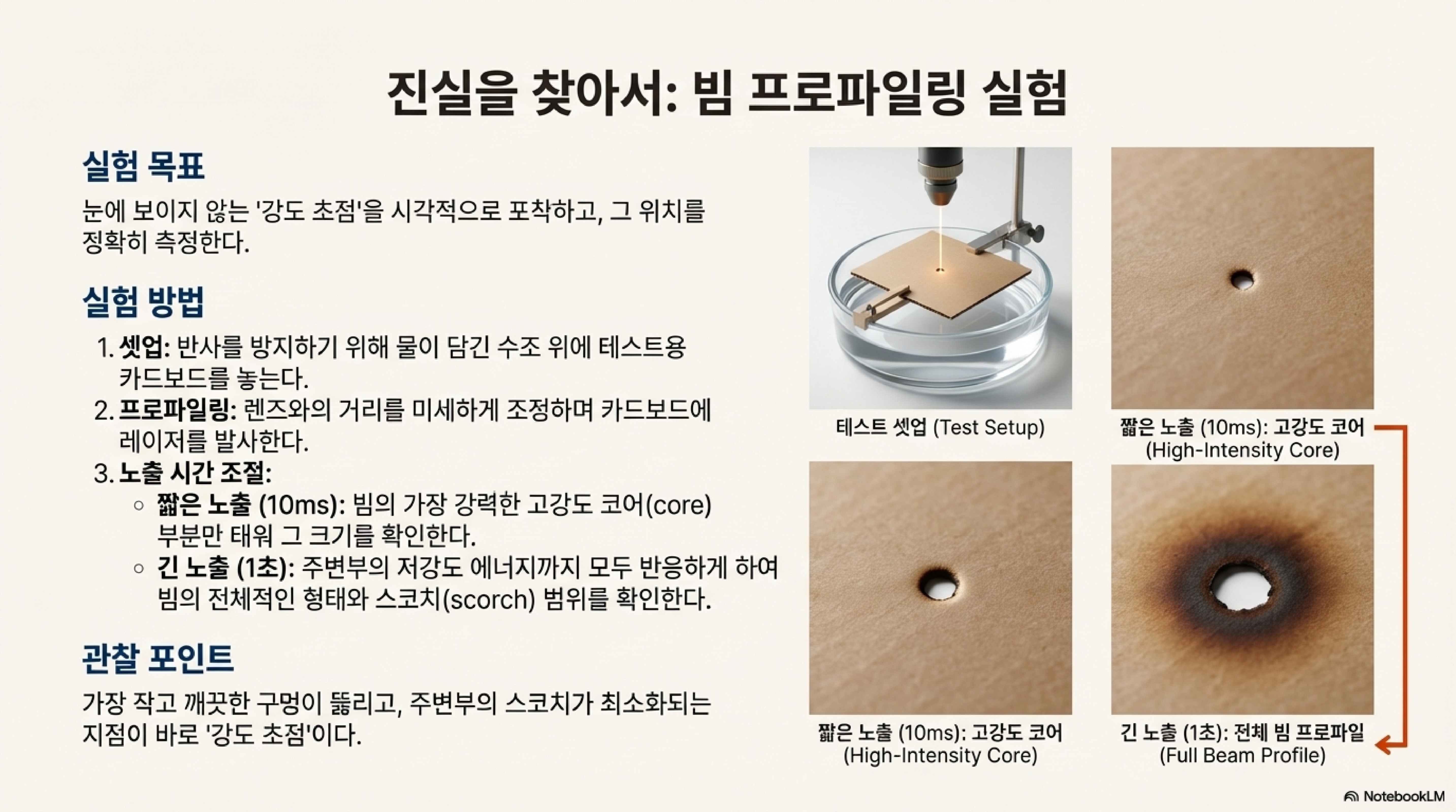"빔의 강도나 손상 능력과 노출 시간 사이에는 명백한 관계가 있습니다. ... 결국, 더 많은 시간을 허용함에 따라 빔이 점점 더 커지는 것을 보게 될 것입니다. 왜냐하면 그와 동시에 상단의 이 부분이 재료를 파고들며 많은 손상을 입히고 있기 때문입니다."