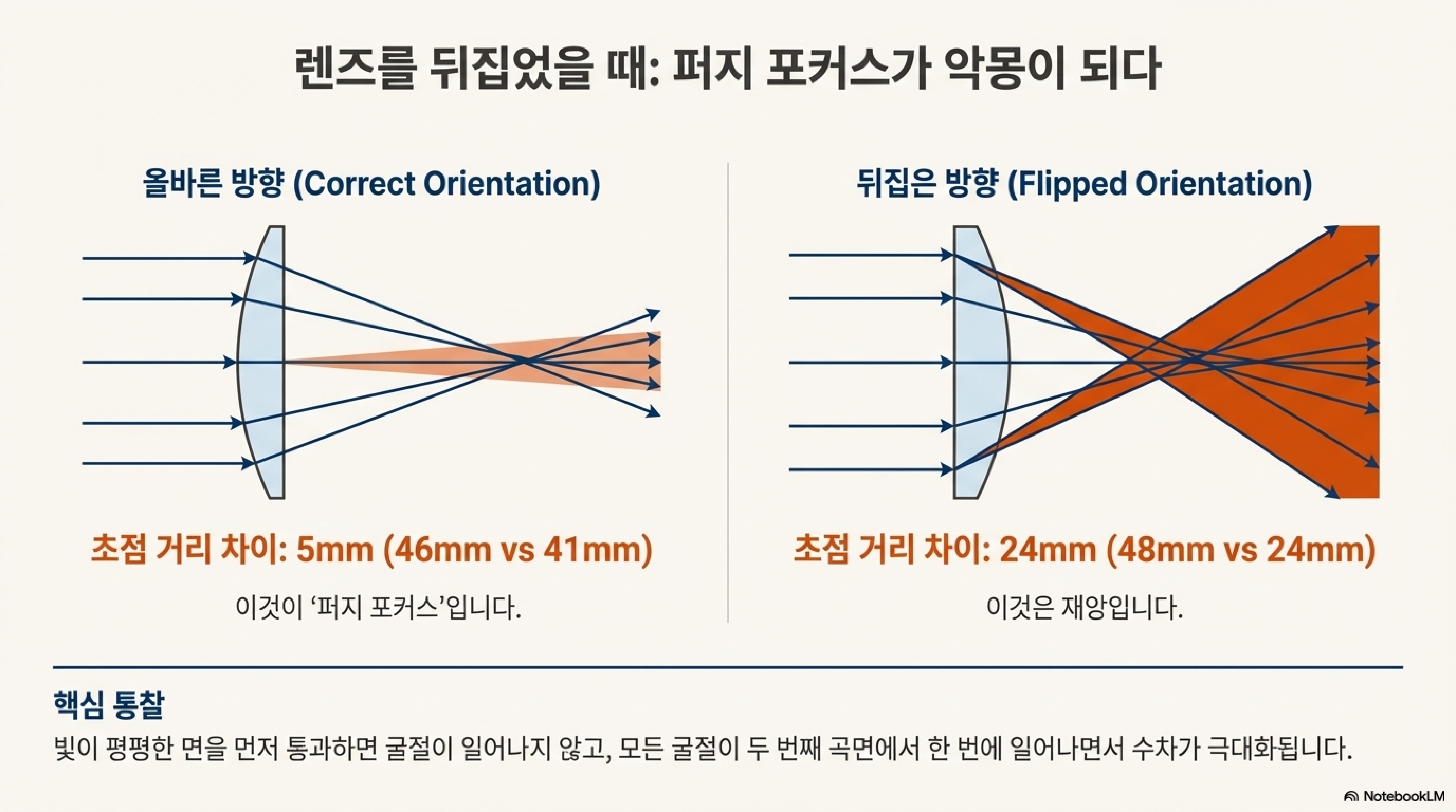 표준 구면 렌즈가 빛을 단 하나의 완벽한 점으로 모은다는 생각은 사실과 다릅니다. '구면 수차(spherical aberration)'라는 현상 때문에, 렌즈의 중심을 통과하는 광선과 가장자리를 통과하는 광선은 서로 다른 거리에 초점을 맺습니다. 그 결과, 날카로운 단일 초점이 아닌 '희미한 초점(fuzzy focus)' 영역이 형성됩니다.