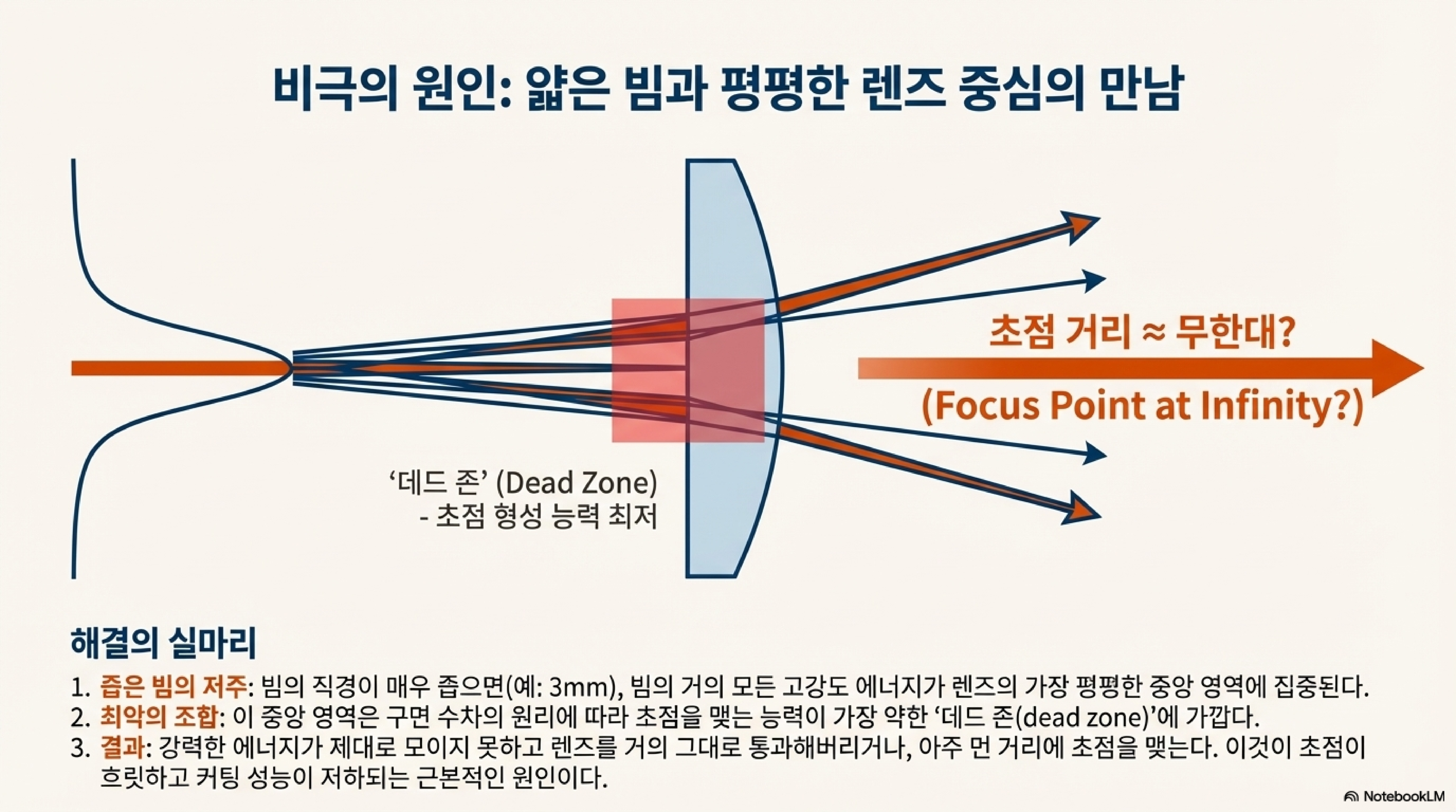 그 이유는 이 고강도 중심부 빔이 구면 렌즈의 표면 중에서 가장 평평한 중앙 부분에 닿기 때문입니다. 이 영역은 곡률이 거의 없기 때문에, 가장 강력한 빛을 거의 굴절시키지 못합니다. 결과적으로, 이 핵심적인 에너지 광선들은 명시된 초점 거리를 훨씬 지나서야 초점을 맺게 되며, 에너지가 분산되어 절단에 효과적으로 기여하지 못합니다. 이는 '씬 빔과 렌즈의 비호환성(the incompatibility of thin beams with lenses)'을 명확히 보여주는 현상입니다. 렌즈가 자신의 가장 강력한 중심 광선을 제대로 집중시키지 못하는 이 명백한 결함은, 완전히 직관에 반하는 해결책으로 저를 이끌었습니다.