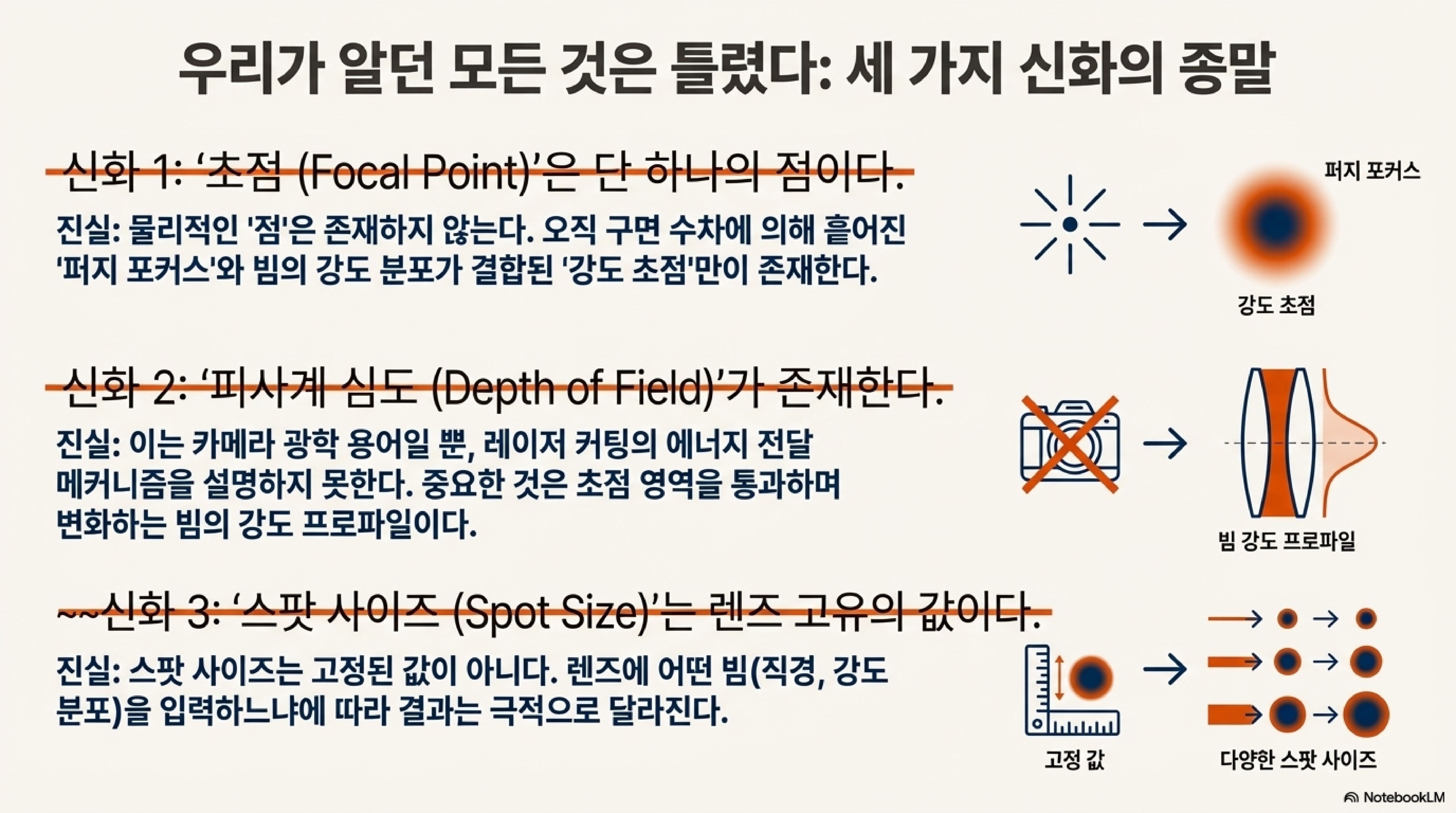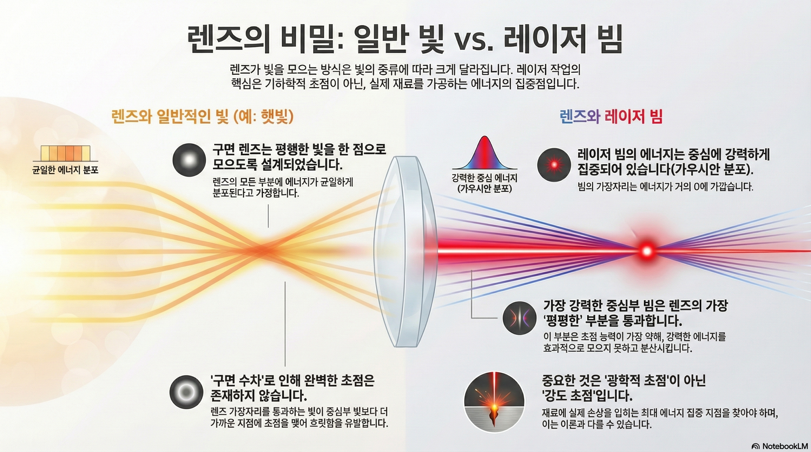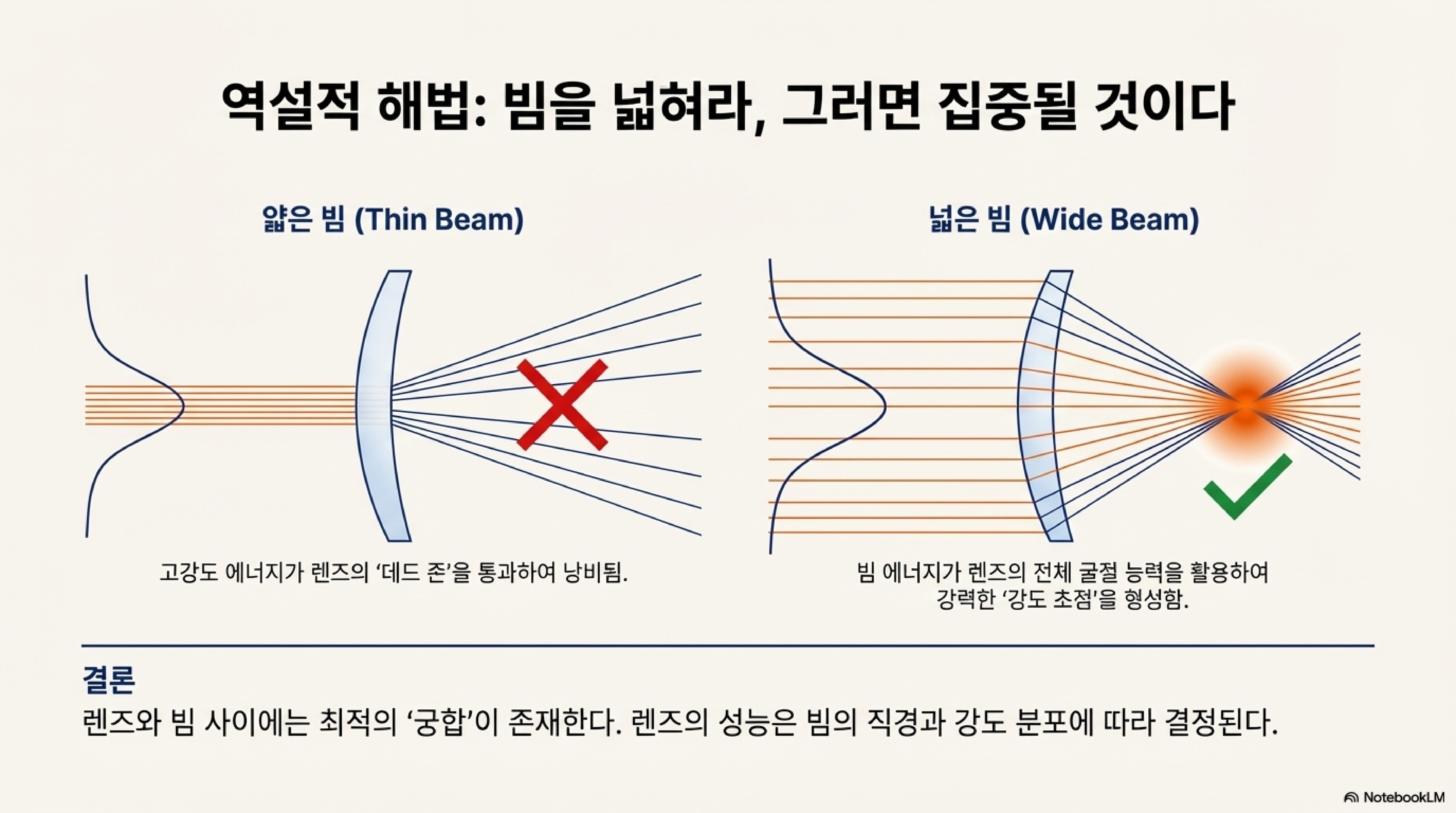 레이저 빔과 렌즈의 관계는 단순한 광학 이론으로 설명할 수 없습니다. 그것은 에너지 분포, 빔의 형태, 렌즈의 기하학적 구조가 복잡하게 얽혀 상호작용하는 과정입니다. 이 글에서 살펴본 바와 같이 '초점'이나 '스팟 사이즈'와 같은 개념들은 절대적인 진리가 아니라, 조건에 따라 변하는 역동적인 변수입니다.