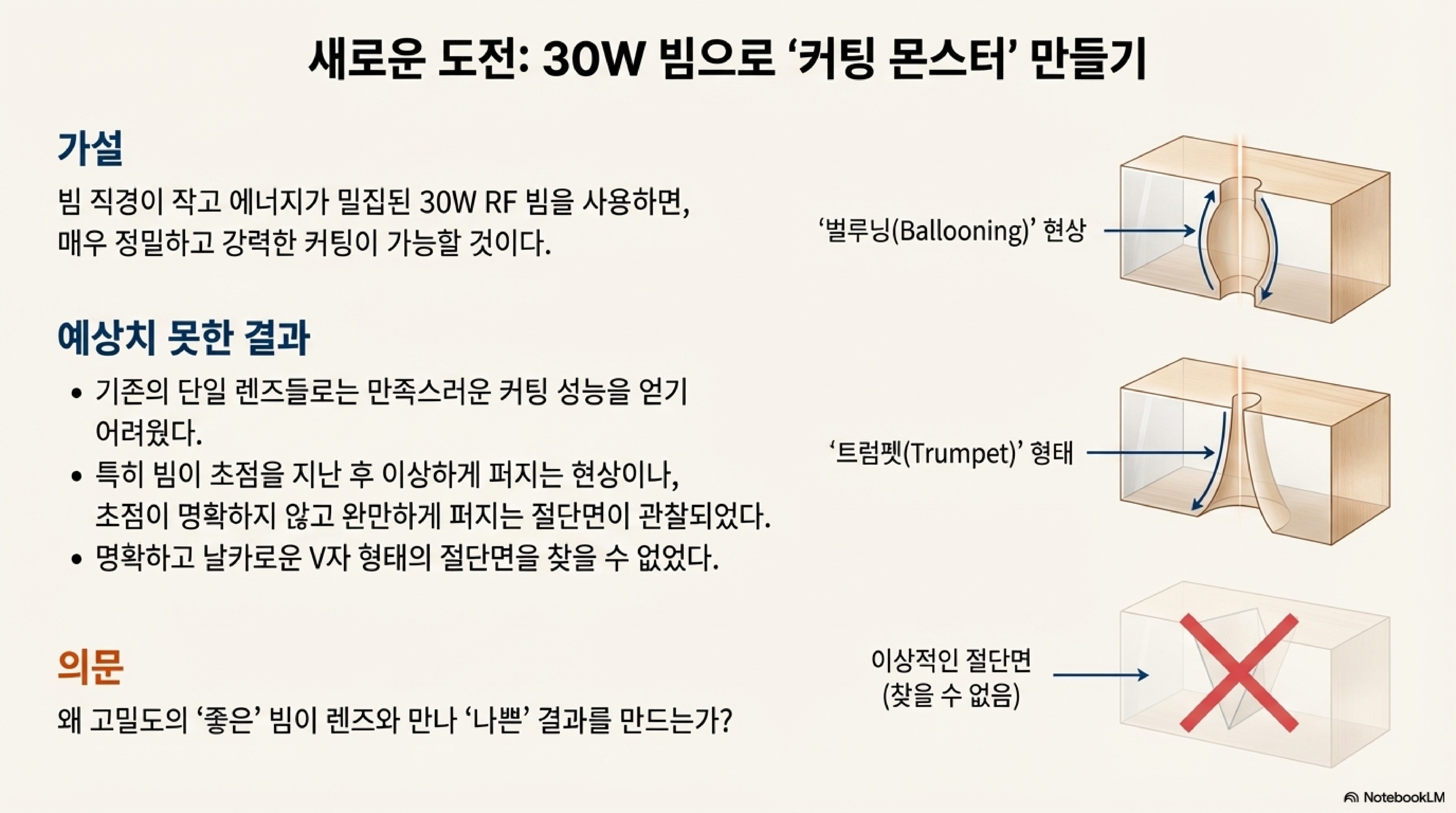 구면 수차를 보정하여 아주 작고 완벽한 스팟을 만드는 복합 렌즈(compound lens)는 정밀한 사진 각인 작업에 탁월한 성능을 보입니다. 하지만 바로 그 '완벽함'이 절단 작업에는 오히려 독이 됩니다. 효율적인 절단은 표준 렌즈가 가진 소위 '약점', 즉 구면 수차를 적극적으로 활용할 때 가능한 것으로 보입니다.
