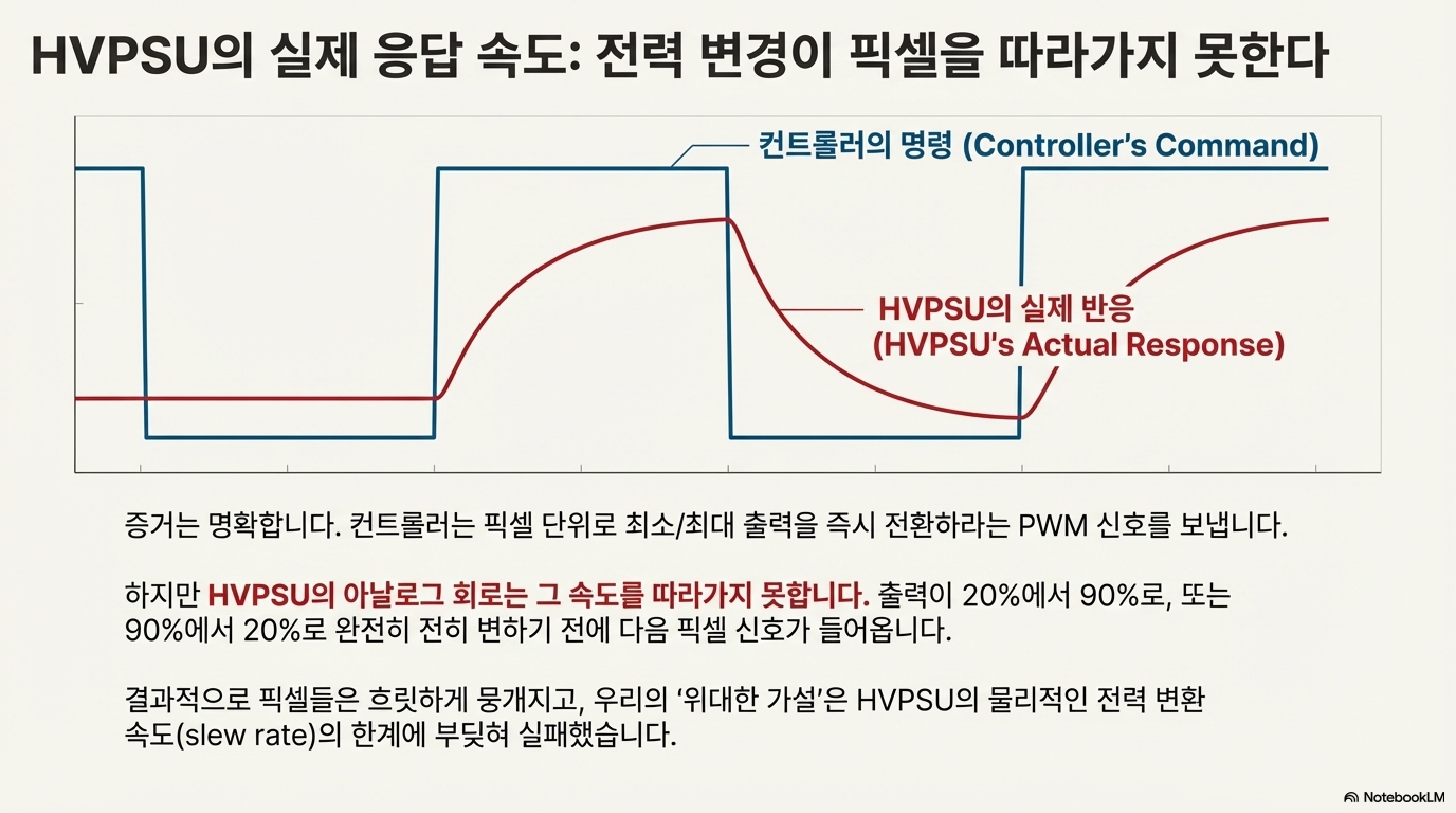 실패의 근본적인 원인은 '예비 이온화'와는 별개의 문제, 바로 전원 공급 장치 자체의 '응답 속도' 한계였습니다. 제어부의 디지털 PWM 신호는 완벽한 사각파 형태로 즉각적인 출력 변경을 명령했지만, 실제 튜브를 흐르는 전류는 그 속도를 따라가지 못하고 완만하고 둥근 아날로그 파형처럼 반응했습니다. 즉, 전원 공급 장치가 낮은 출력(254)과 높은 출력(0) 사이를 픽셀 단위의 속도로 오갈 만큼 민첩하지 못했던 것입니다. 이것이 바로 디지털로 제어되는 시스템의 아날로그적 한계입니다.