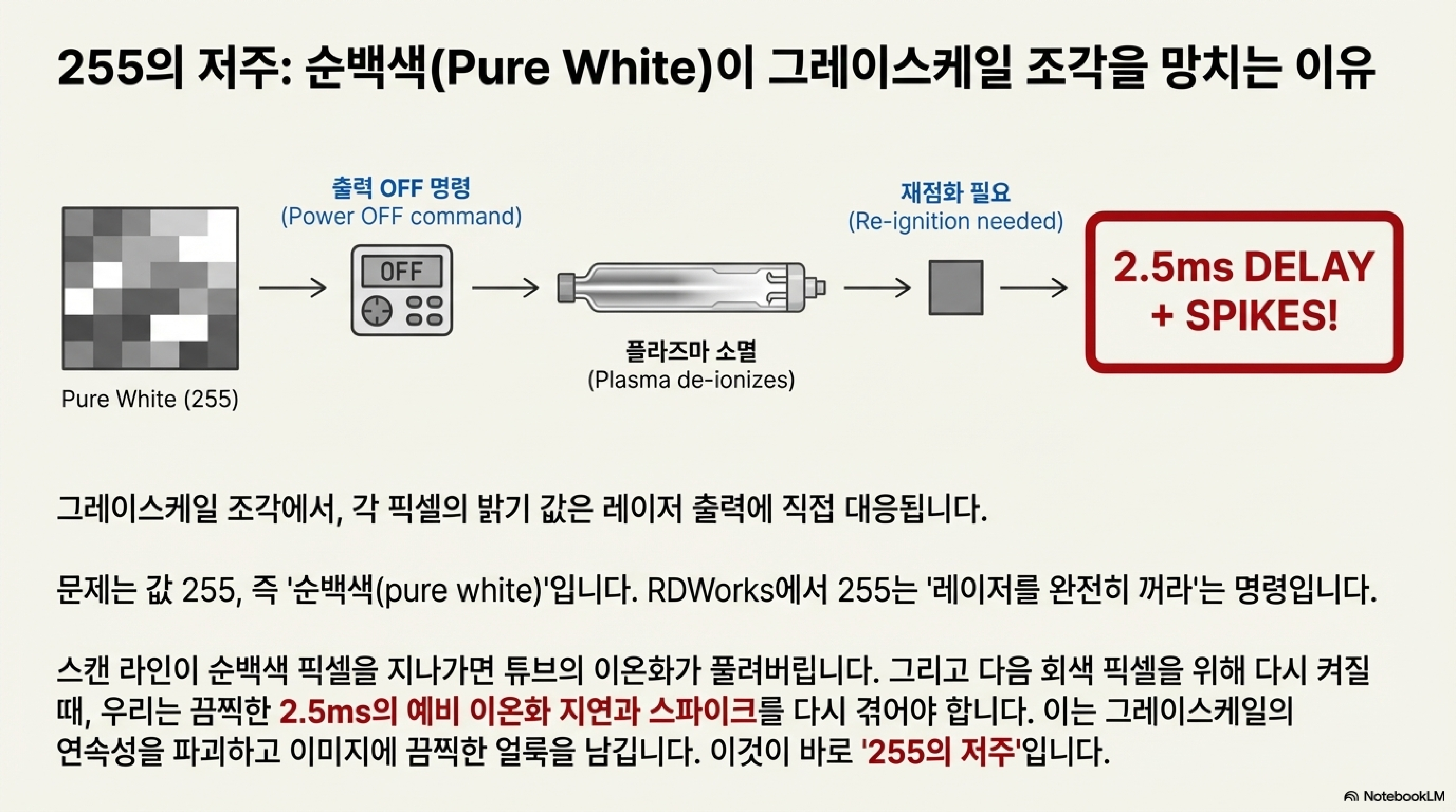 컴퓨터에게 값 255는 레이저 튜브의 전원을 **'완전히 끄라'**는 명령으로 해석됩니다. 레이저 헤드가 스캔 라인을 따라 빠르게 움직이는 도중에 튜브가 꺼졌다가 다시 켜지는 상황을 상상해 보십시오. 튜브가 다시 켜질 때마다, 앞에서 설명한 길고 불안정한 '예비 이온화' 지연과 출력 스파이크가 다시 발생합니다.