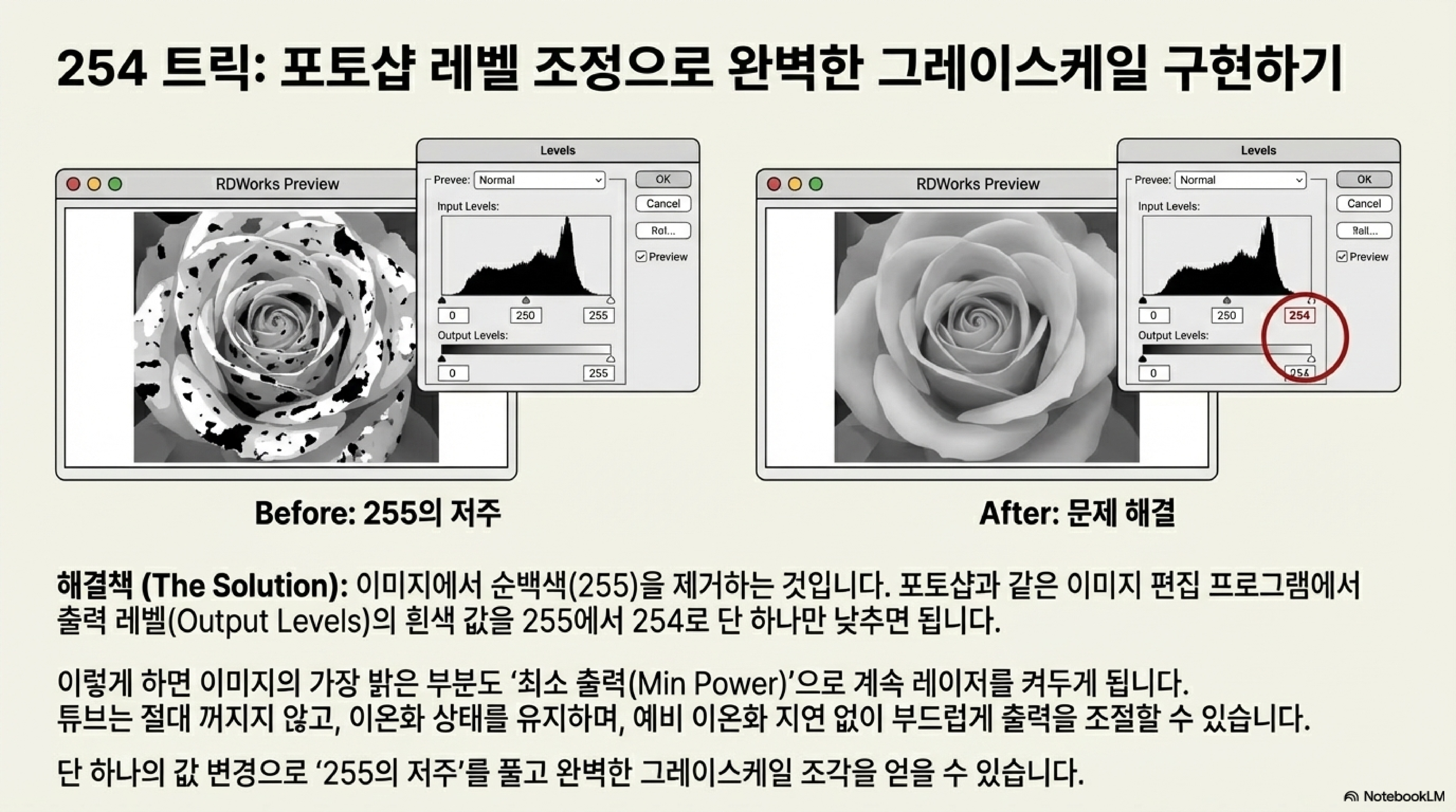사진을 각인할 때 사용하는 그레이스케일 모드('직접 출력')에서, 이미지의 순수한 흰색(디지털 값 255) 픽셀은 심각한 문제를 일으킵니다. 왜 그럴까요?