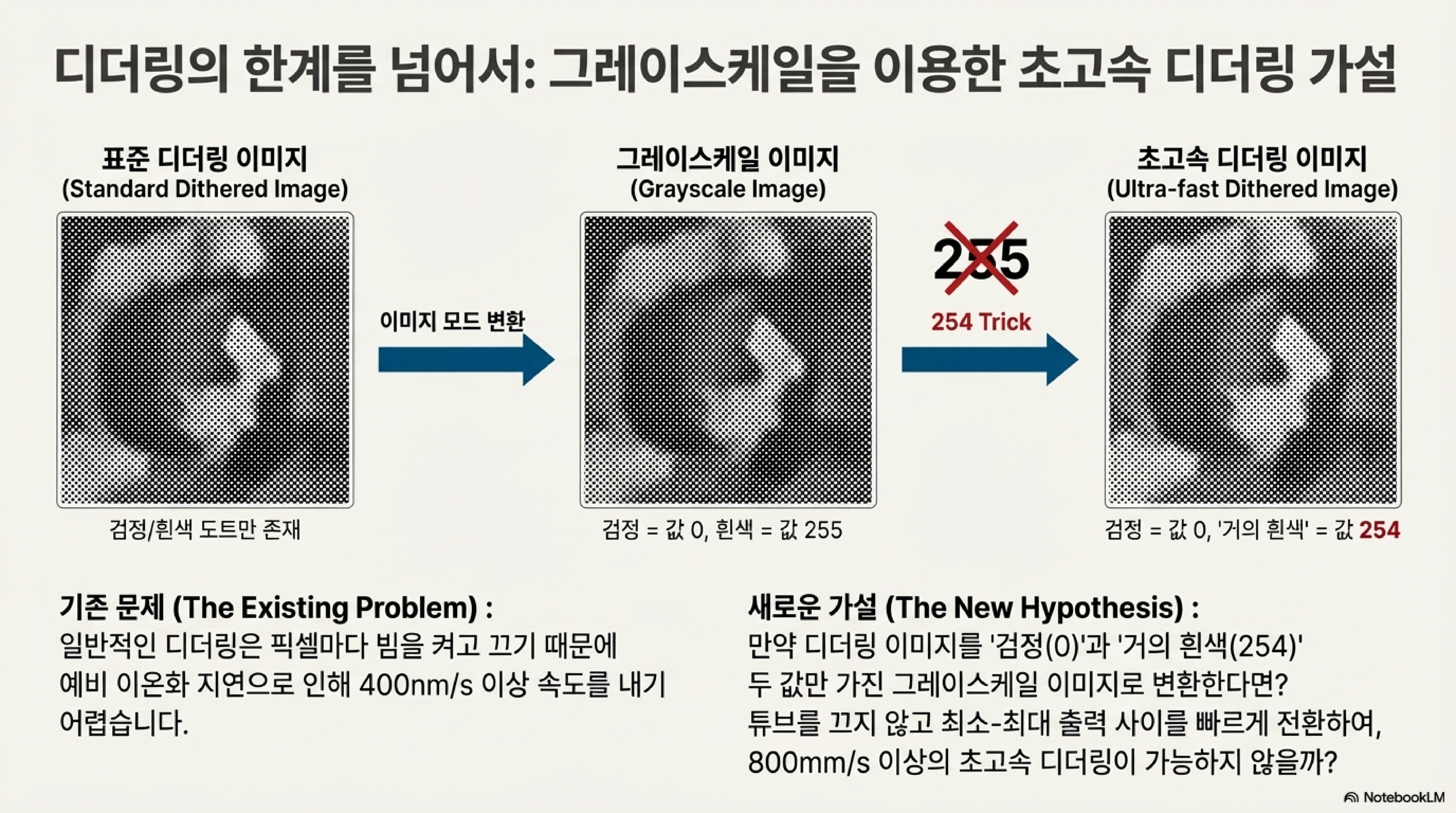 그래서 저는 기발한 아이디어를 떠올렸습니다. 물론 많은 기발한 아이디어들이 그렇듯, 이 역시 기발한 실패로 끝났습니다. 가설은 이랬습니다. "디더링(Dithering)된 흑백 이미지를 0(검은색)과 254(거의 흰색) 값만 사용하는 그레이스케일 이미지로 변환하자. '254 트릭'으로 예비 이온화 문제를 피했으니, 이론적으로는 픽셀 단위로 출력을 초고속으로 전환하며 완벽한 디더링 각인이 가능할 것이다."