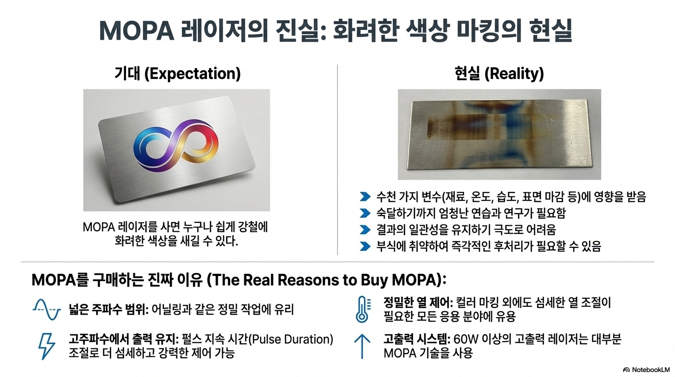 화려한 컬러 마킹에 대한 환상보다는, 이러한 실제적인 장점이 필요한 경우에 MOPA 레이저를 선택하는 것이 현명합니다.