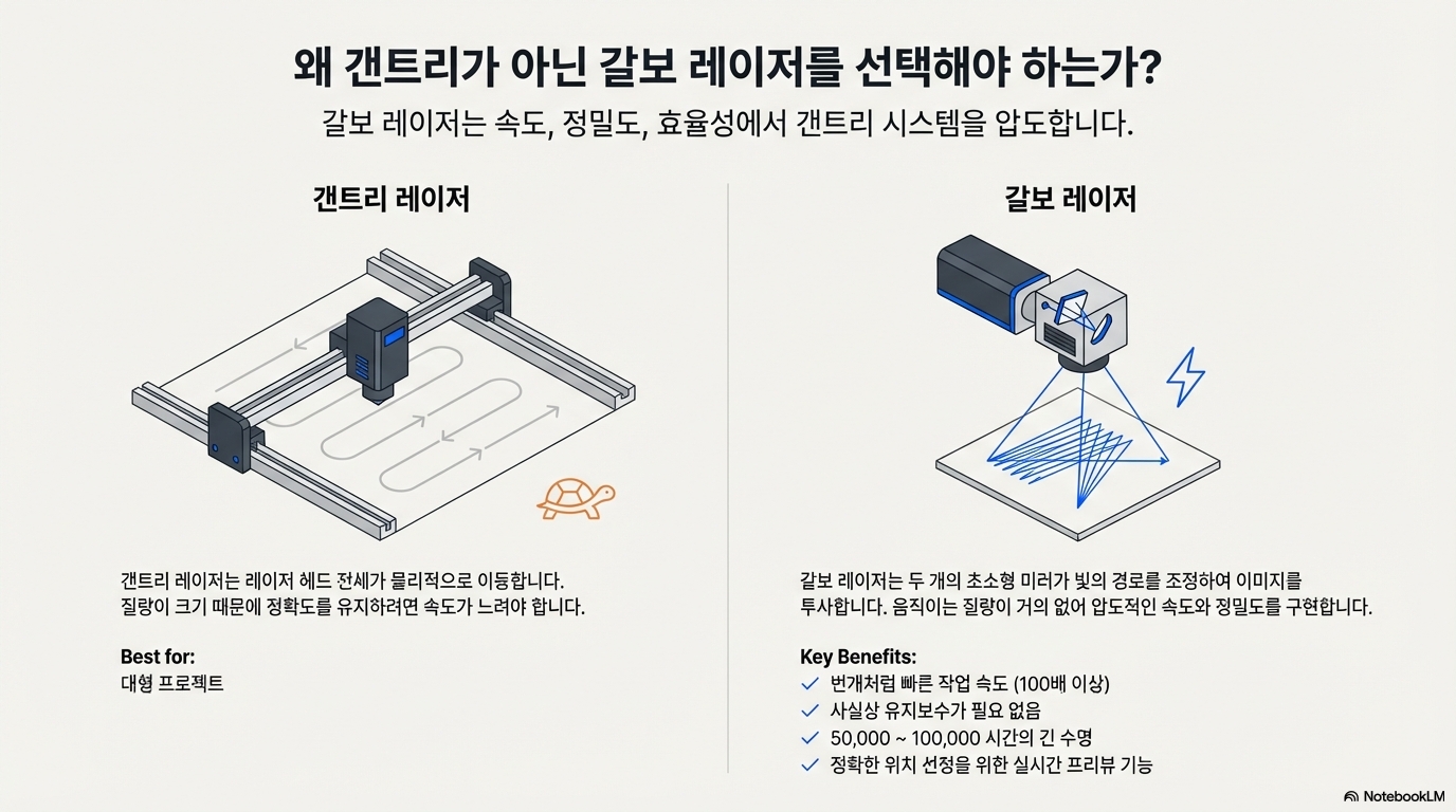 "갈보 레이저가 빠르다"는 사실은 많이 알려져 있습니다. 하지만 그 차이가 어느 정도인지는 정확히 알지 못하는 경우가 많습니다. 갈보 레이저는 일반적인 갠트리(Gantry) 방식 레이저보다 최대 100배 더 빠릅니다. 이는 단순한 과장이 아니라, 작동 방식의 근본적인 차이에서 비롯됩니다.
