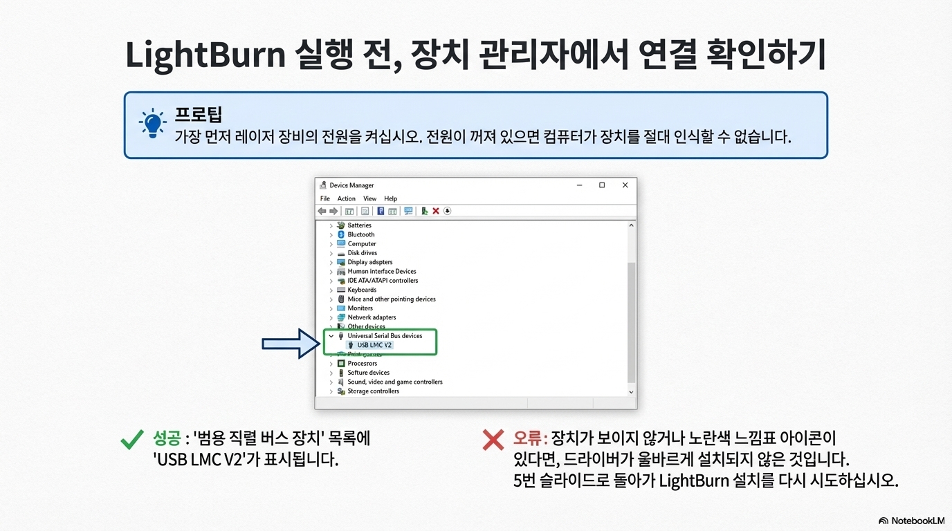드라이버가 올바르게 설치되었다면, 다음으로 흔히 발생하는 문제는 소프트웨어와 하드웨어 간의 단순한 통신 오류입니다. 따라서 LightBurn을 실행하기 전에 레이저 장비의 전원을 켜고, 윈도우의 "장치 관리자"를 통해 연결이 확실한지 증명하는 과정은 필수입니다.