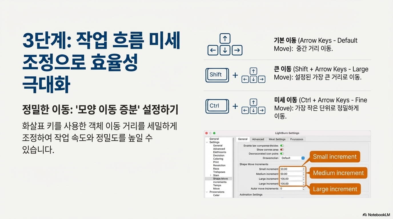 키보드 방향키로 객체를 정밀하게 이동시키는 것은 작업의 완성도를 높이는 핵심 과정입니다. LightBurn에서는 '도형 이동 간격(Shape move increments)' 설정을 통해 이 움직임을 완벽하게 제어할 수 있습니다.